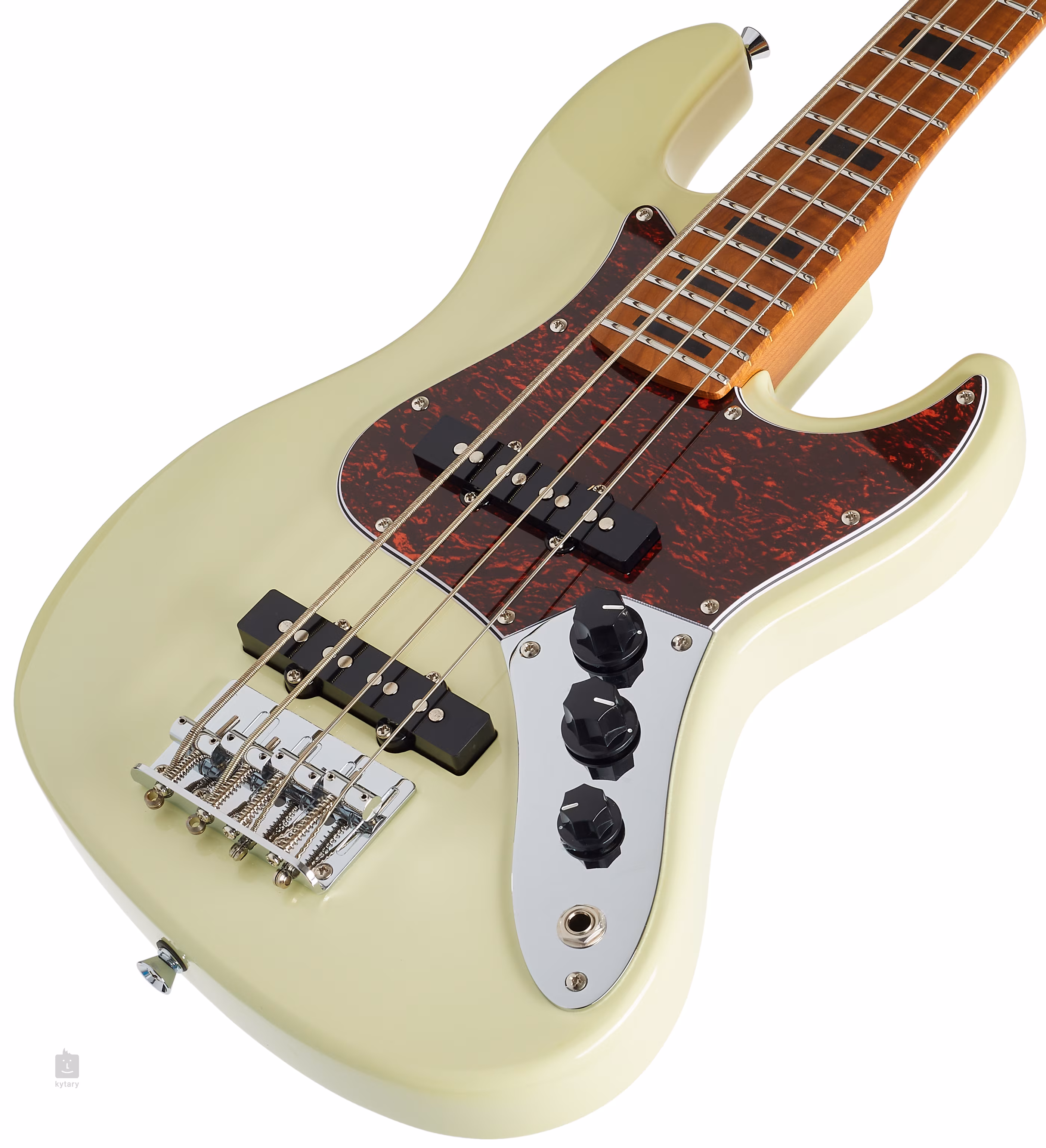 Baskytara je osazena dvěma JB style snímači. Charakter zvuku upravíte pomocí ovladačů hlasitosti snímačů a potenciometru tónové clony. Struny jsou uchyceny v chromovaných ladicích mechanikách ve vintage stylu a kobylce se čtyřmi sedly. Stylové zpracování podtrhuje pickguard z imitace želvoviny a firemní logo na hlavici.