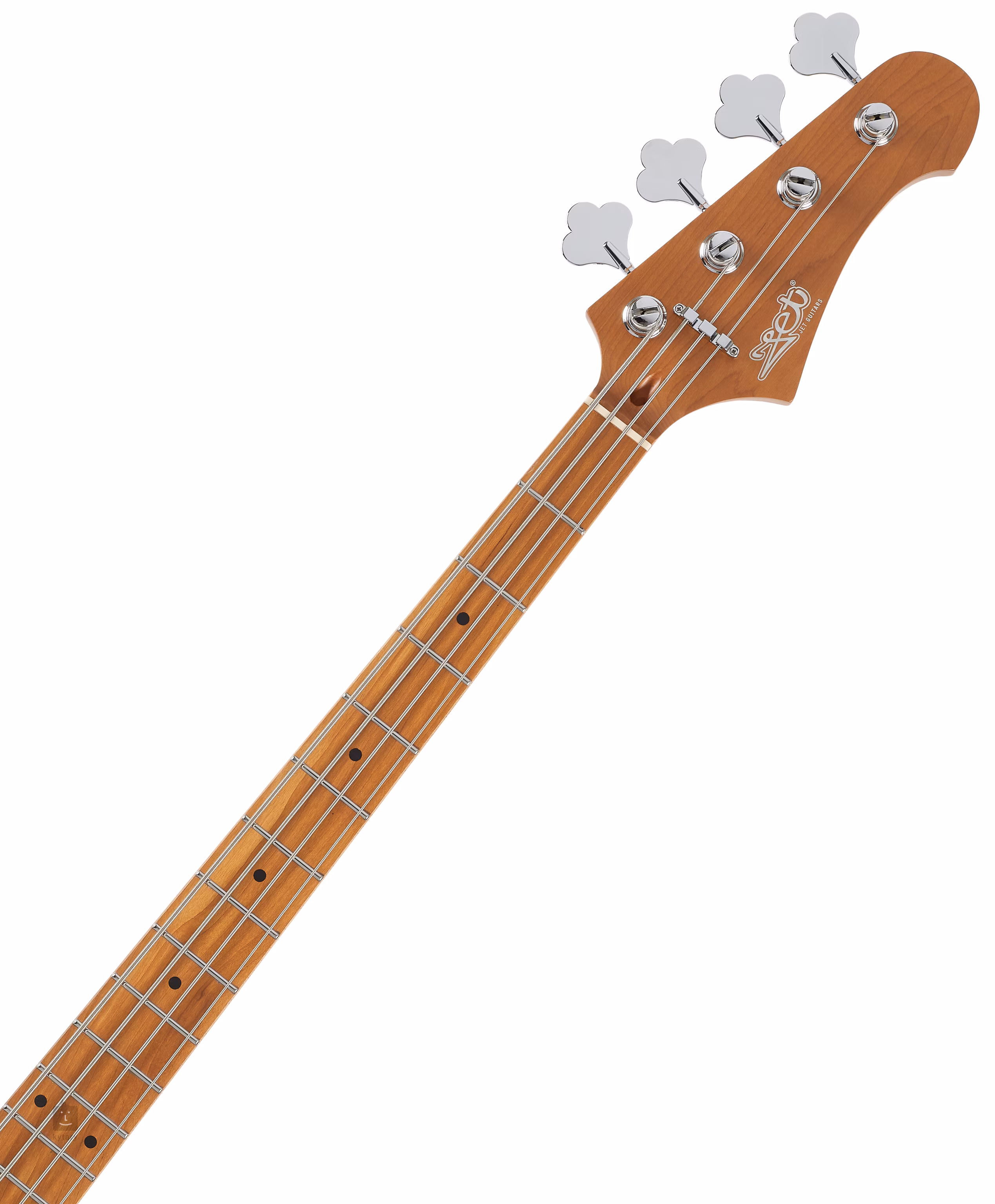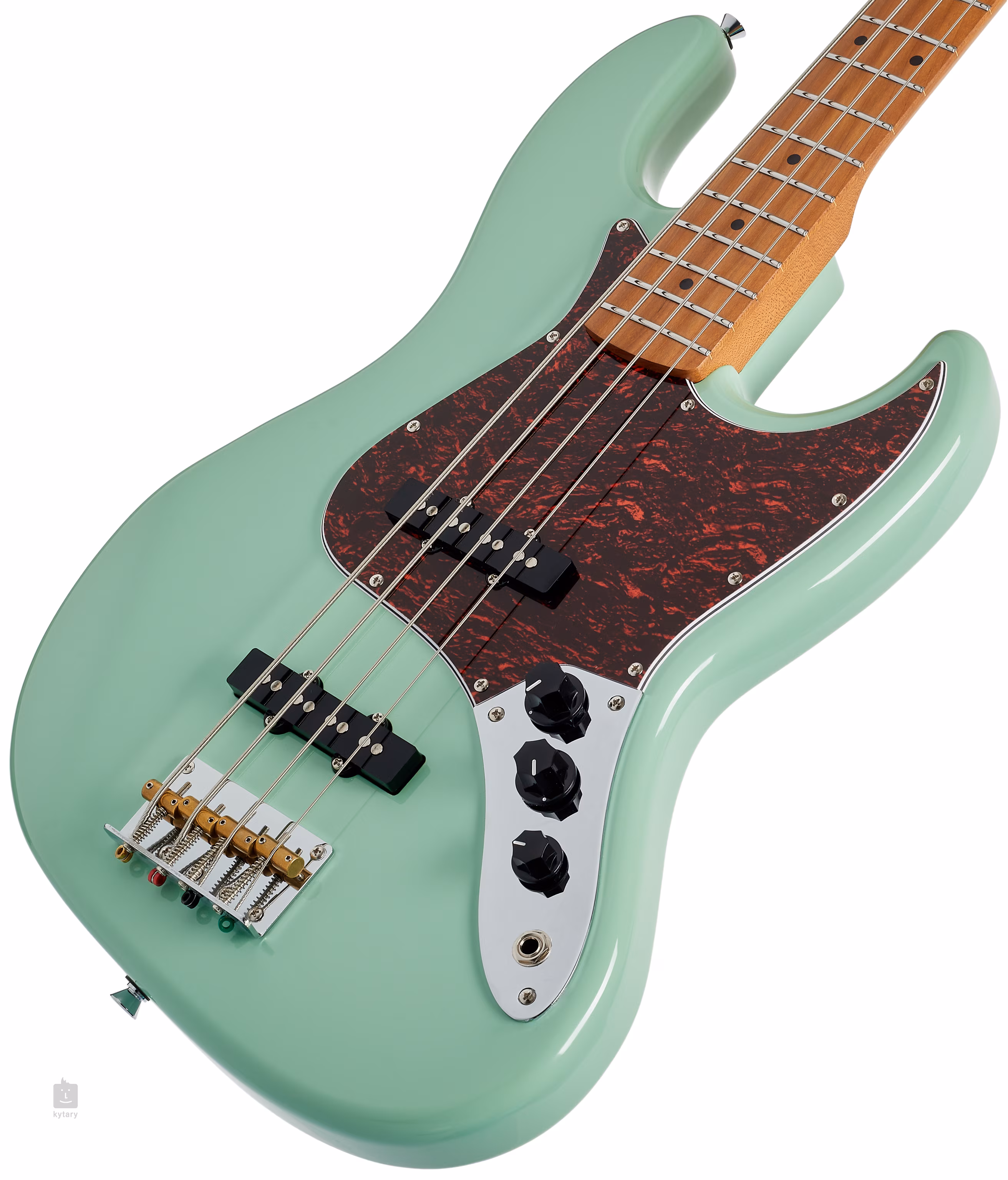 Baskytara je osazena dvěma JB style snímači. Charakter zvuku upravíte pomocí ovladačů hlasitosti snímačů a potenciometru tónové clony. Struny jsou uchyceny v chromovaných ladicích mechanikách ve vintage stylu a kobylce se čtyřmi sedly. Stylové zpracování podtrhuje pickguard z imitace želvoviny a firemní logo na hlavici.