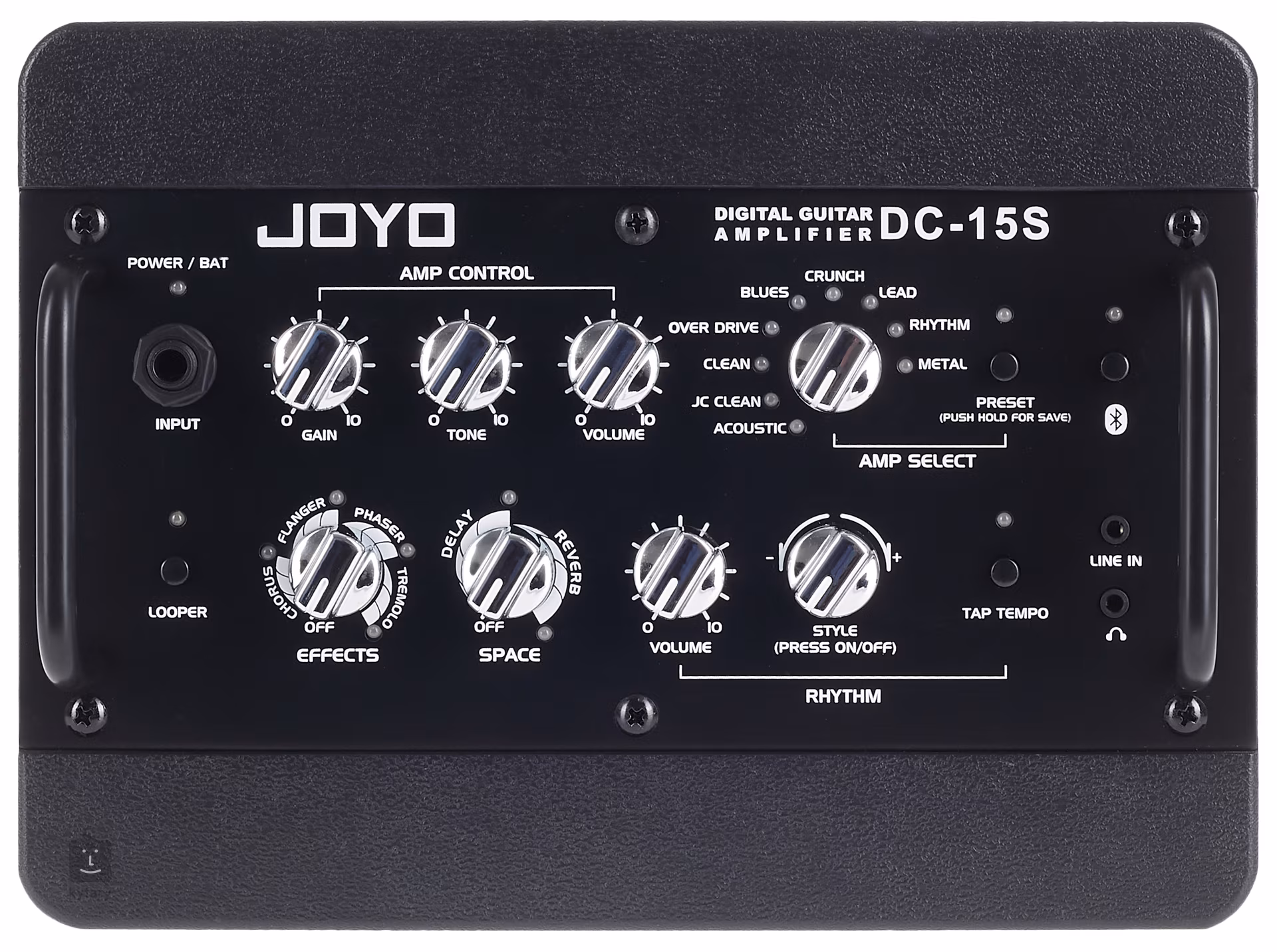 • Ovládání Gain, Tone, 2x Volume, Amp Select, Effects, Space, Rhythm, Buttons. Looper, Preset, Bluetooth, Tap Tempo