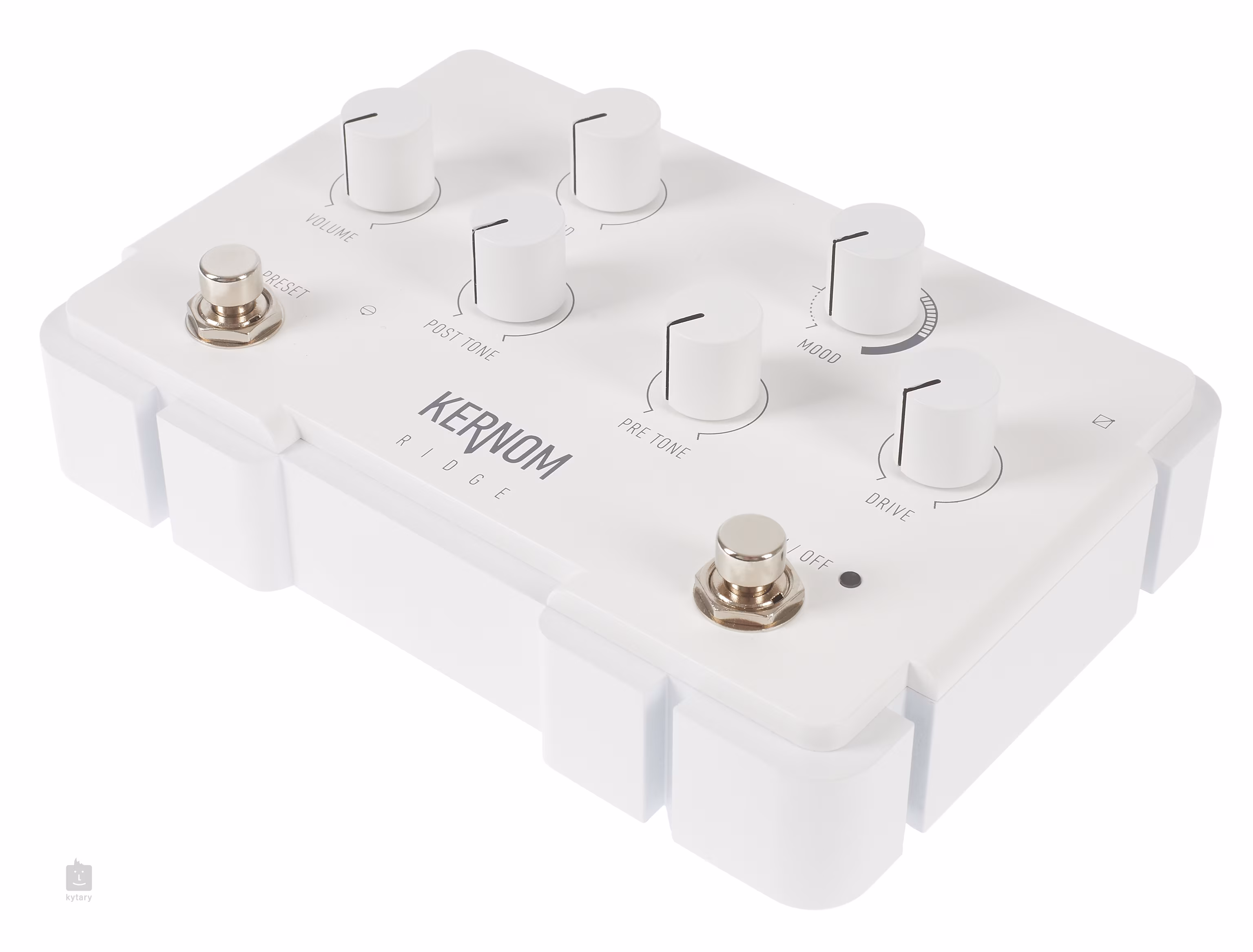Pedálový efekt Kernom Ridge je moderní analogový overdrive s funkcemi, které u většiny běžných OD efektů nenaleznete. Výrobce v podtitulu uvádí “The million moods overdrive” a je to právě ovladač Mood, co nabízí širokou škálu příměsí clippingu - symetrický, asymetrický, soft, hard a vše v meziprostoru. Knoby Pre a Post Tone umístěné před a za overdrivem/clippingem určují odezvu pedálu na kytarový signál a podobu výstupního zvuku. Nastavení zbylých ovladačů definuje výstupní hlasitost, míru overdrive a charakter zvuku ve středových frekvencích.