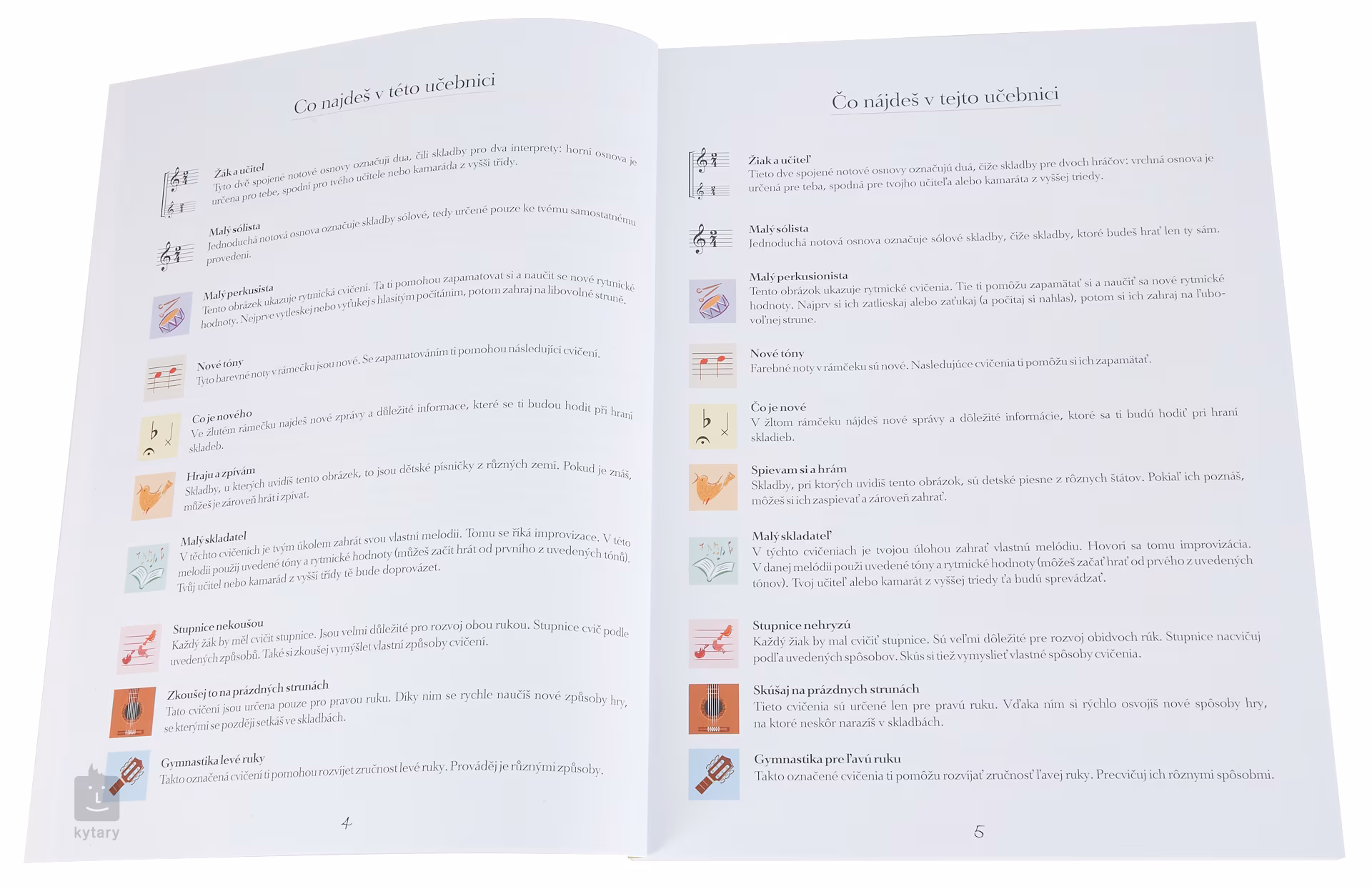 Učebnice o 128 stranách je vybavena bohatými barevnými ilustracemi, které vhodně doplňují její hudební obsah. Navíc - noty i slova jsou tištěna ve větší velikosti než je obvyklé a dětem se tak lehčeji a příjemněji čtou. Pro rychlou orientaci v publikaci jsou některá cvičení a skladbičky podbarveny a nechybí ani vysvětlující ikonky.