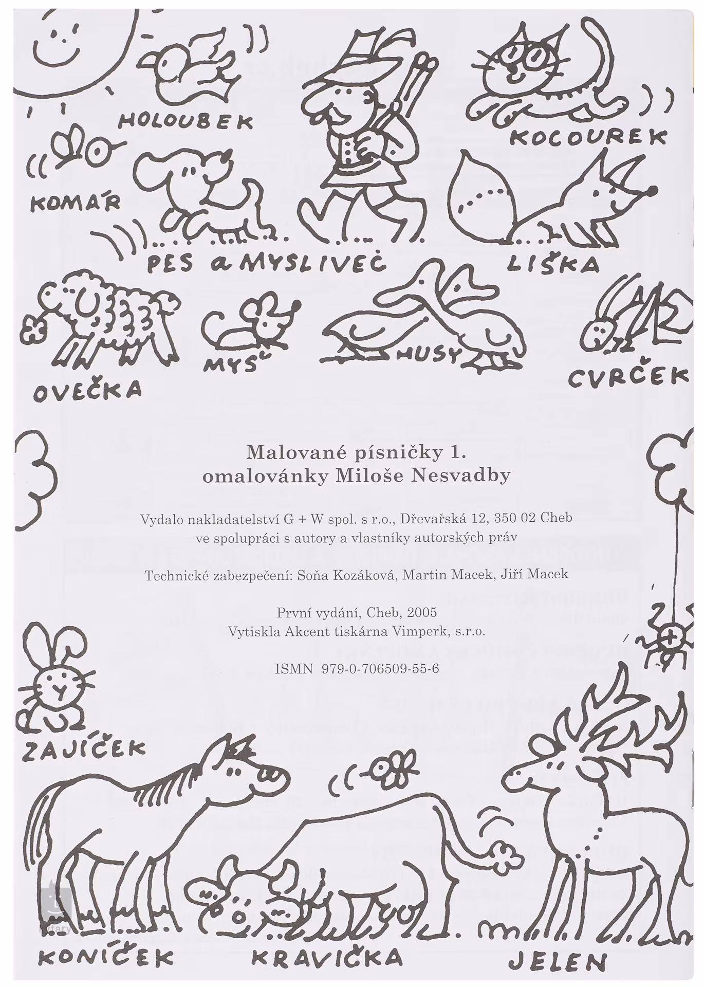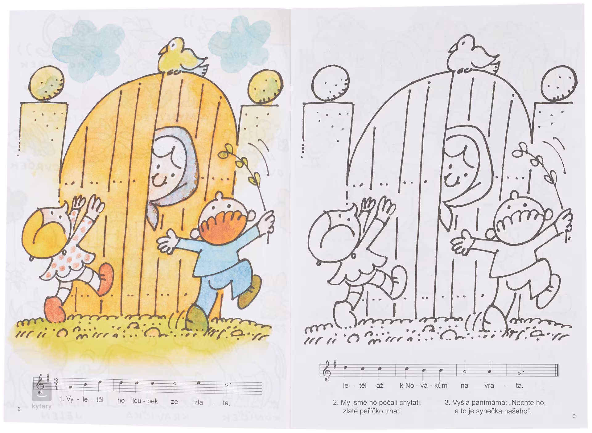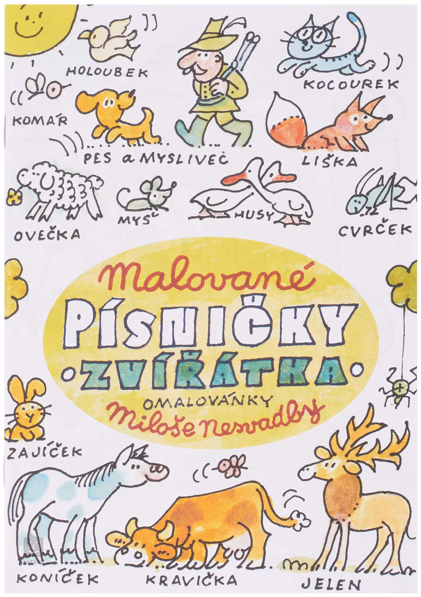 Kniha omalovánek obsahuje písně o zvířatech pro děti: Vyletěl holoubek, Utíkej Káčo, utíkej, Skákal pes, Sedí liška pod dubem, Pásla ovečky, Ovčáci čtveráci, Na tý louce zelený, Myšičko, Krokodýl, Komáři se ženili, Kočka leze dírou, Když jsem koníčky pásával.