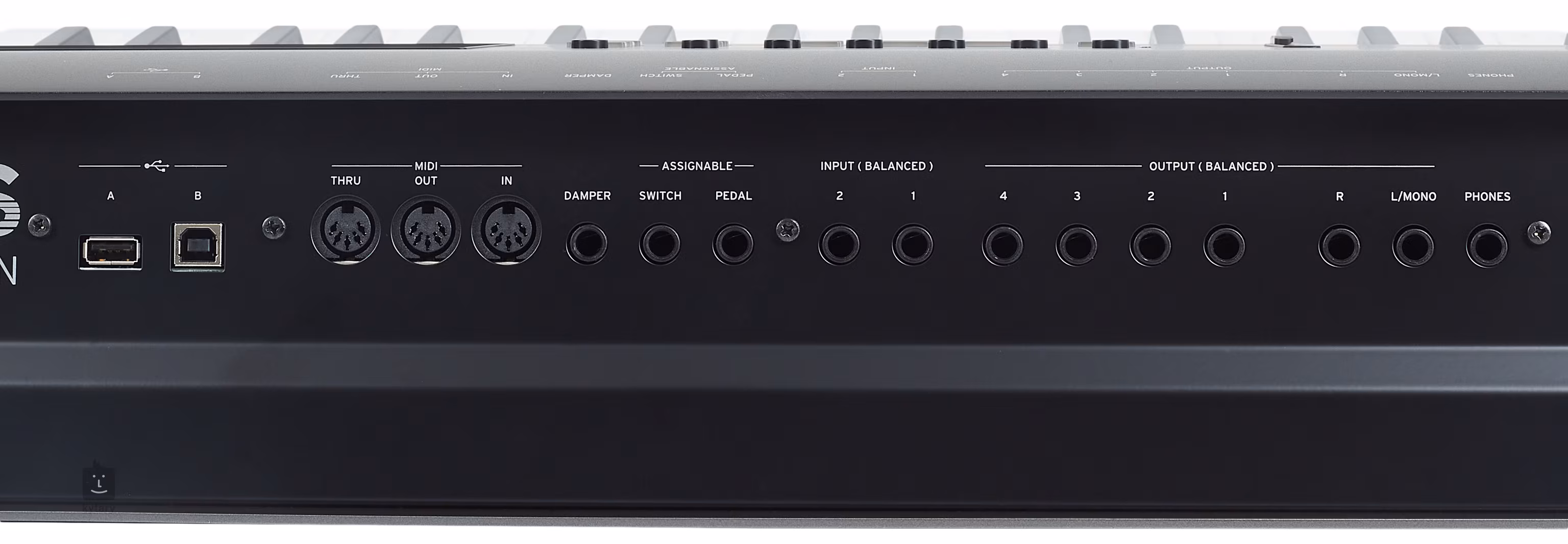 Hlavní zvukový výstup nástroje tvoří dvojice symetrických konektorů jack 6,3 mm TRS, nicméně k dispozici jsou další 4 individuálně nastavitelné výstupy (4 x jack 6,3 mm TRS) pro maximální variabilitu ozvučení a nechybí samozřejmě sluchátkový výstup (stereo jack 6,3 mm). Vstupní kanály tvoří dva symetrické konektory (jack 6,3 mm TRS) a dále 3 konektory (jack 6,3 mm) pro potřeby připojení ovládání v podobě externích pedálů. Samozřejmostí je plnohodnotné MIDI rozhraní s 5-pin DIN konektory. To ale není vše, NAUTILUS také funguje jako dvoukanálové zvukové rozhraní a MIDI převodník přes USB, takže pro práci na počítači nepotřebujete ani externí zvukovou kartu. Do druhého USB slotu pak připojíte např. QWERTY klávesnici nebo externí kontroler.