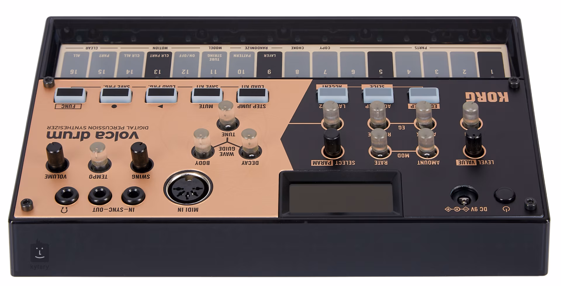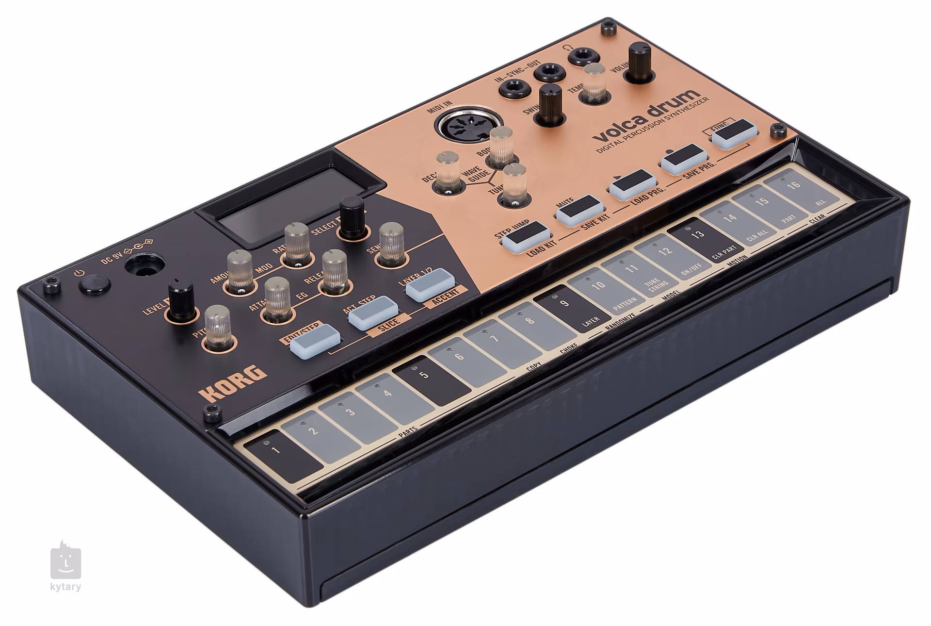 Korg Volca Drum rozšiřuje sérii Volca o bicí syntezáor, který poskytuje široké možnosti pro tvorbu vlastních perkusivních zvuků. Kromě výkonného DSP je k dispozici propracovaný sekvencér s polyrytmy, Slice funkce pro přidávání rychlých breaků a nechybí ani Choke pro vzájemné tlumení jednotlivých skupin (např. otevřená/zavřená hi-hata). Bicí sadu lze složit ze šesti „bubnů,“ z nichž každý může mít dvě vrstvy. Do paměti se těchto sad vejde celkem 16 a továrně je nastavených 10 kitů. Vytvořte vlastní zvuky Zvuk vytvoříte výběrem jednoho z pěti vlnových průběhů (např. sinus, pila, šum), tří pitch modulátorů a tří generátorů obálky přizpůsobených pro bicí zvuky. Navrstvené parametry mohou být nastavovány individuálně nebo současně, vrstvit lze i stejné zvuky pro docílení pořádně tlustého tónu. Pokročilé efekty Zvuk každého bubnu snadno vysoustružíte pomocí bitové redukce, wavefoldingu pro získání harmonických přeslechů nebo zkreslení pomocí overdrive efektu. Tímto způsobem docílíte široké zvukové palety, jejíž barvy najdou uplatnění v řadě hudebních stylů. Efektová sekce nabízí waveguide rezonátor založený na fyzikálním modelingu, který zvuku přidává vyladěné rezonance. V případě waveguidu neboli vlnovodu lze volit ze dvou typů – cylindrického, připomínající korpus bubnu nebo podlouhlý objekt, a strunného, přidávajícího zvuku zvonivý charakter. Sekvencér s polyrytmy Sekvencér se šestnácti kroky nabízí možnost nahrávání po krocích nebo v reálném čase, možnost řetězení patternů (až 16) nebo nahrávání pohybů tlačítek pro vytváření zvukových variací. Funkce Active Step umožňuje ze sekvence odstranit jeden krok a vytvářet tak polyrytmy (u každého zvuku zvlášť) a živé vystoupení se dá také obohatit pomocí funkce Jump, která vás přenese na konkrétní místo v sekvenci. Pomocí Slice vytvoříte rychlé breaky s možností nastavit počet úderů a celou sekvenci tak náležitě vygradujete. Živé beaty Abyste docílili živých beatů, stačí si pohrát s akcenty, které jsou k dispozici hned v šestnácti úrovních. Funkce Choke pak zajistí tlumení jednotlivých částí, pokud by měly hrát současně. Nejčastější využití je pro otevřenou/uzavřenou hi-hatu, kreativitě se však meze nekladou. Nechybí také propracované random funkce pro nahodilé změny zvuku, breaku, kroku akcentu ad. Ovládání probíhá pomocí knobů a jasného LCD displeje, které se nachází na hliníkovém panelu.