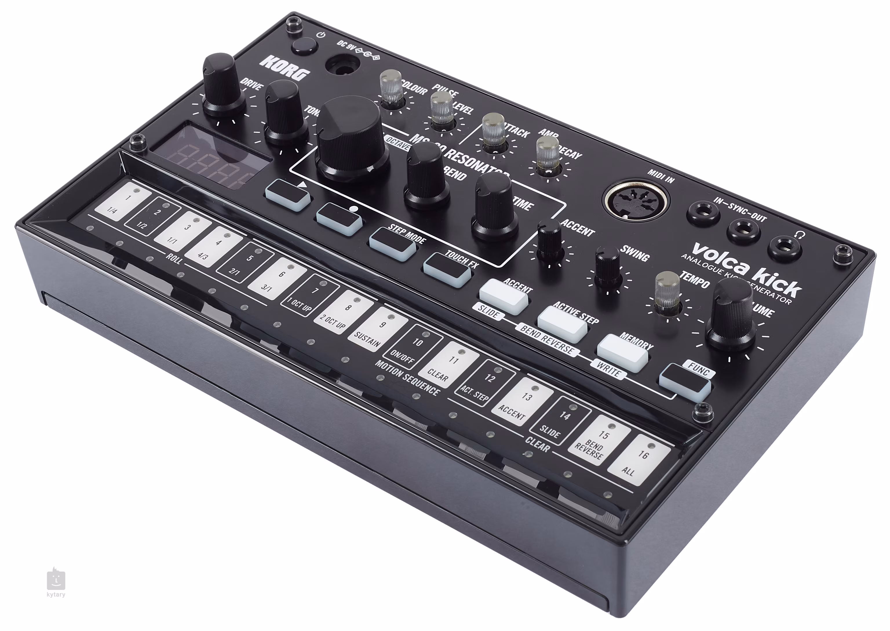 Analogový okruh založený na hutném zvuku slavného syntezátoru Korg MS-20 vám umožní vytvořit veškeré odstíny basového bubnu, na které si vzpomenete. Šestnáctistopý sekvencér s efektovou jednotkou umožní ovládání všech efektů a parametrů v reálném čase a vytvářet tak spontánní beaty s řadou zvratů a modulací. Syntezátor lze pomocí propojovacího kabelu synchronizovat s dalšími jednotkami a nechybí ani MIDI vstup, umožňující kontrolu přímo z vašeho oblíbeného DAW. Díky těmto vlastnostem je Korg Volca Kick ideálním pomocníkem jak do studia, tak pro živé hraní.