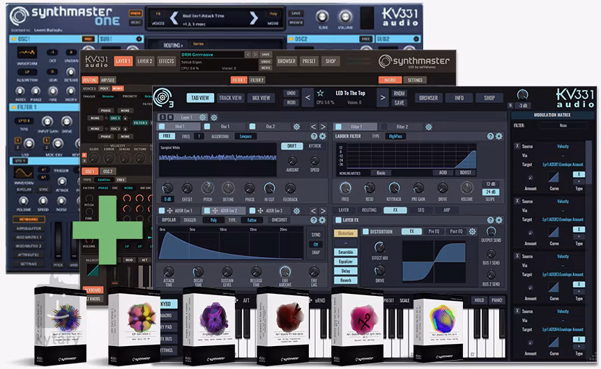 KV331 Audio SynthMaster Standard Bundle obsahuje 3 virtuální instrumenty a celkem 6 expanzí s prémiovými presety.