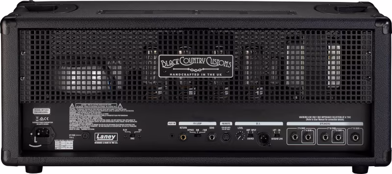 K dispozici jsou také bohaté možnosti konektivity. Zatímco na přední straně se nachází pouze standardní nástrojový vstup, zadní panel je vybaven efektovou smyčkou (Send, Return), linkovým vstupem pro přehrávání externích zdrojů zvuku (Aux in) a 5pinovým vstupem pro externí footswitch Laney FS4 (součástí balení). Součástí výbavy je také praktický DI výstup s emulací reproduktorů, který můžete využít pro přímé propojení zesilovače s mixem nebo DAW a samozřejmě také sada výstupů pro reprobox (2x 8Ω/1x 4Ω, 2x 16Ω/1x 8Ω nebo 1x 16Ω). V levé části zadního panelu pak najdete přepínač pro dva typy elektronek – EL34 nebo 6L6 – který využijete v případě, že se rozhodnete elektronky vyměnit.