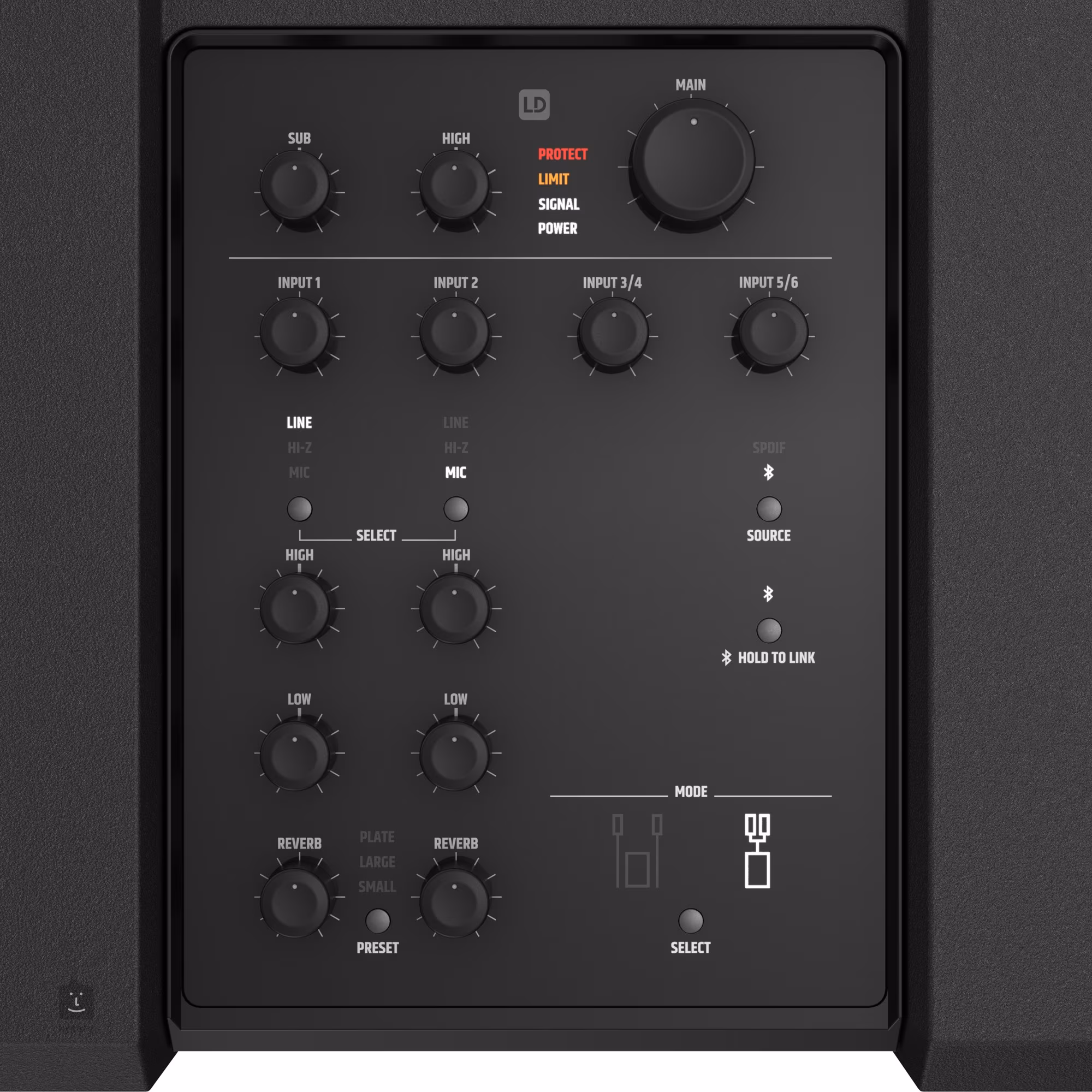 Ozvučovací sestava nabízí šestikanálový mix se separovaným dvoupásmovým EQ a efektem reveb. První dva kanály jsou ideální pro připojení mikrofonu nebo nástrojů s vyšší impedancí jako kytar/baskytar, stereo linkové vstupy kanálů 3 a 4 jsou vhodné pro připojení kláves, syntezátorů, bicích automatů nebo menších elektronických bicích. Digitální SPDIF stereo vstup a kompatibilita s Bluetooth vám umožňuje propojit ozvučovací sestavu s multimediálními přehrávači, PC nebo smartphony, vstupy kanálů 5 a 6 lze rovněž použít pro karaoke systémy nebo pro připojení TV.