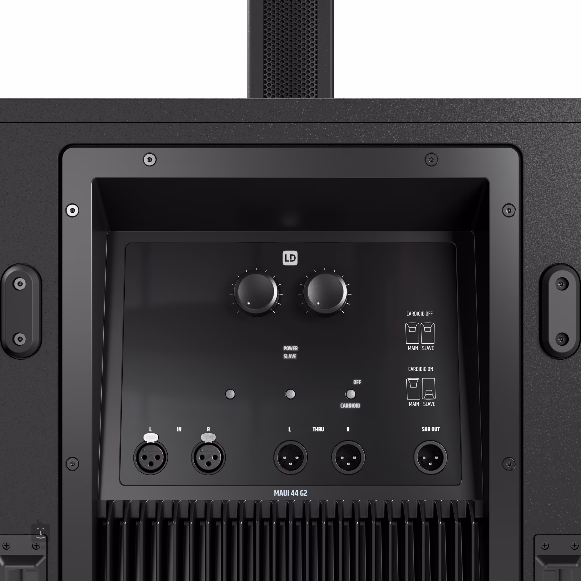 Subwoofer spolu se dvěma satelity a zesilovačem třídy D vám poskytne maximální výkon až 1500W. Hlavní panel je vybaven stereo XLR vstupy a ovladačem hlasitosti pro subwoofer nebo Main Volume pro celkovou hlasitost. K synchronizaci s Bluetooth stačí pouze najít ve svém smartphonu MAUI 44G2 a začnete streamovat vaši oblíbenou hudbu. Funkce Cardioid vám umožní rozptýlit u subwooferu nízké a střední frekvence do všech směrů. K připojení dalšího PA můžete využít stereo XLR výstupy a pokud byste měli ještě jednu sestavu MAUI 44 G2, tak je můžete propojit zcela bezdrátově čímž získáte brilantní stereo zvuk, který už opravdu zvládne ozvučit i větší venkovní koncerty. Rychlé a pohodlné propojení mezi dvěma satelity a subwooferem umožňuje sloupový systém zbavený jakýchkoliv kabelů. MAUI 44 G2 se tak hodí na mobilní instalace a bez problému ozvučí svatbu, venkovní koncert, konferenci, fitness centrum nebo koncert na lodi.