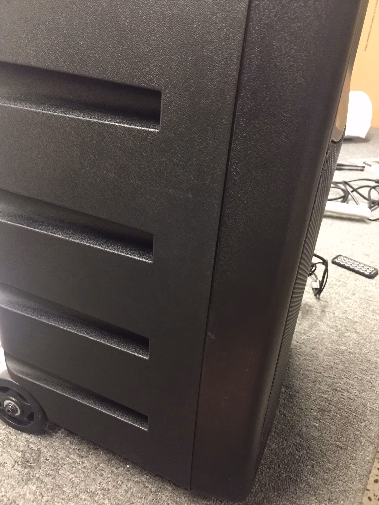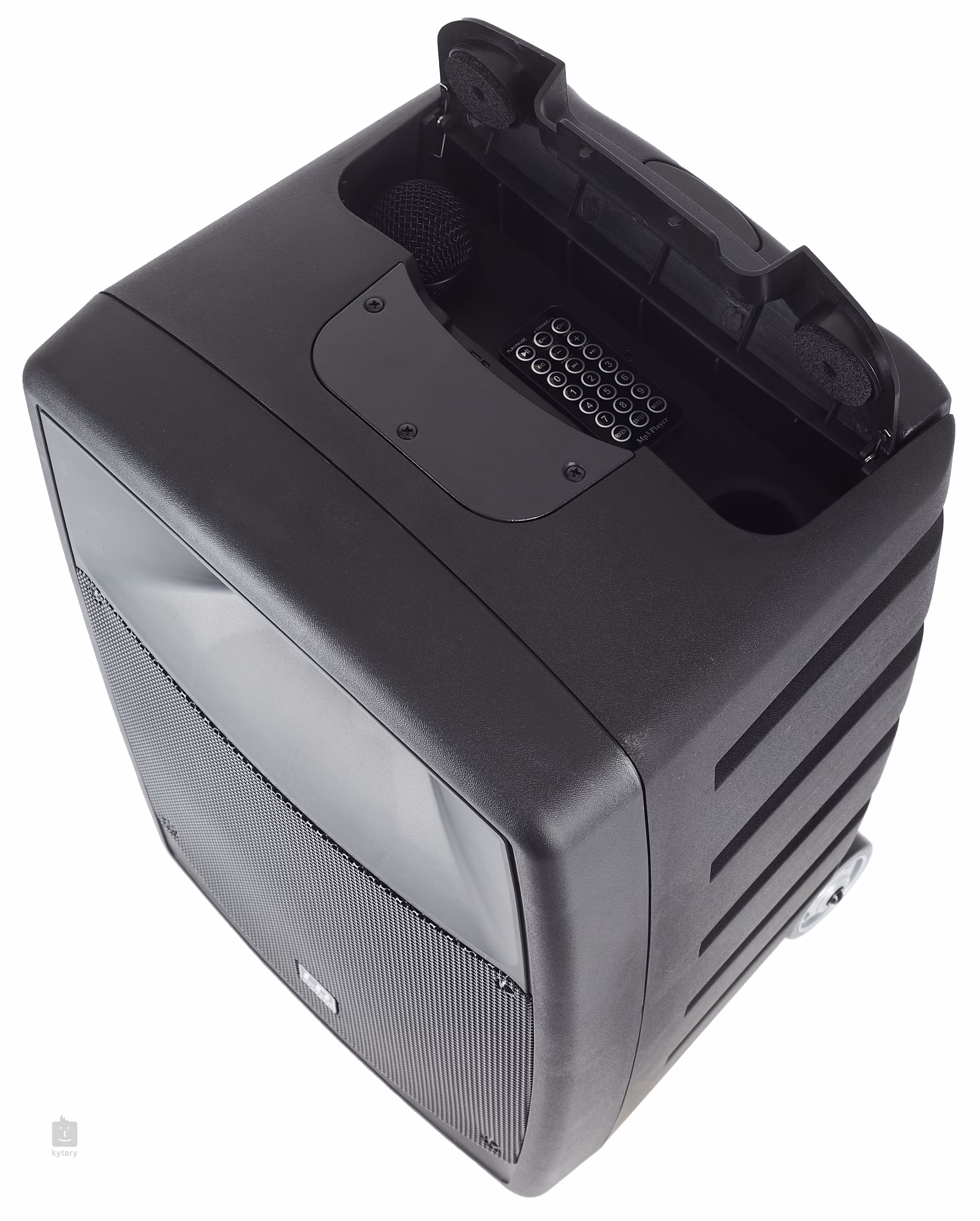 Díky zabudovaným kolečkům a teleskopické rukojeti se reprobox snadno převáží a na vrchním panelu zbyl také prostor pro uložení až dvou bezdrátových mikrofonů.