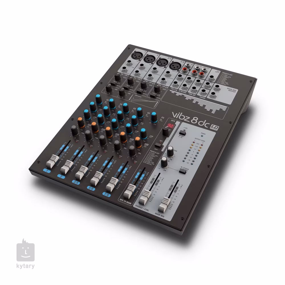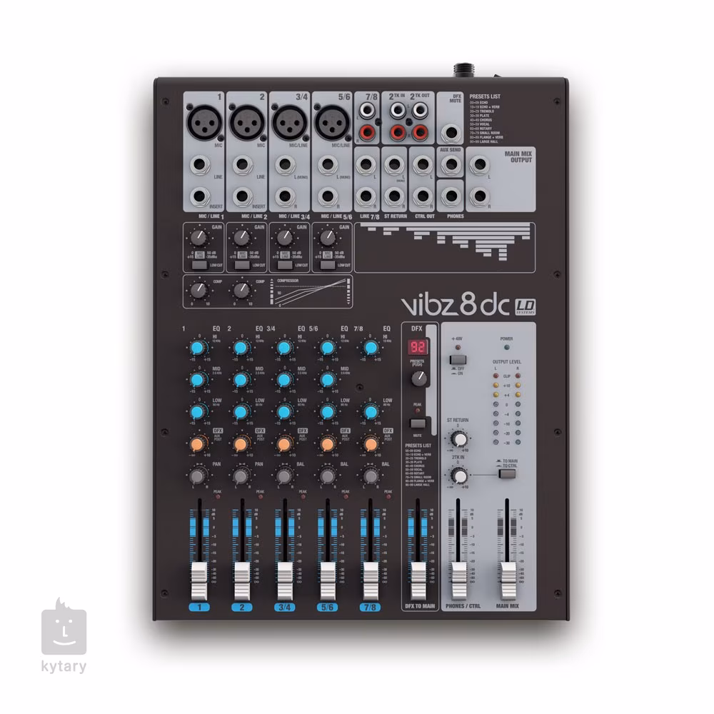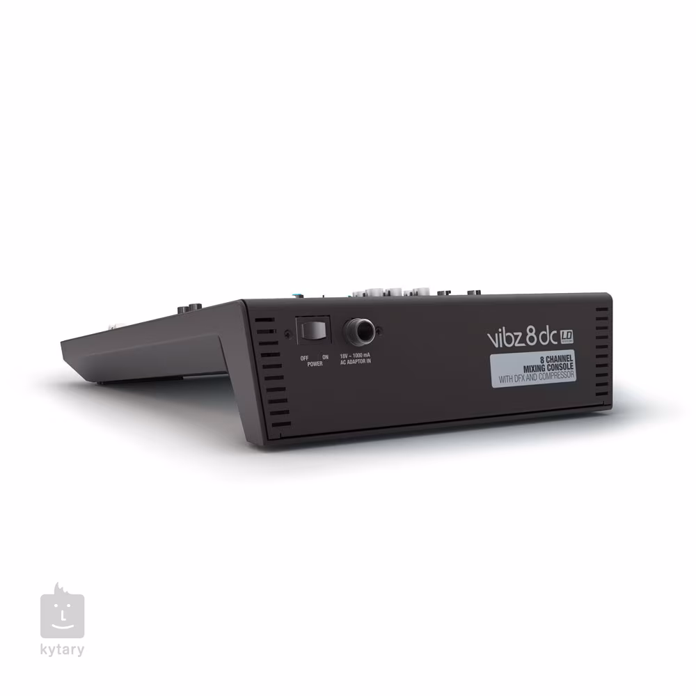 VIBZ 8 DC nabízí 4 mikrofonní vstupy s kvalitními předzesilovači, mono kompatibilní stereo linkové vstupy, compressor s plynulým nastavením na prvních dvou kanálech, dvojici insertních vstupů a 100 digitálních efektů. Díky tomu jde o velmi flexibilní pult vhodný pro menší kapely a společenské akce.