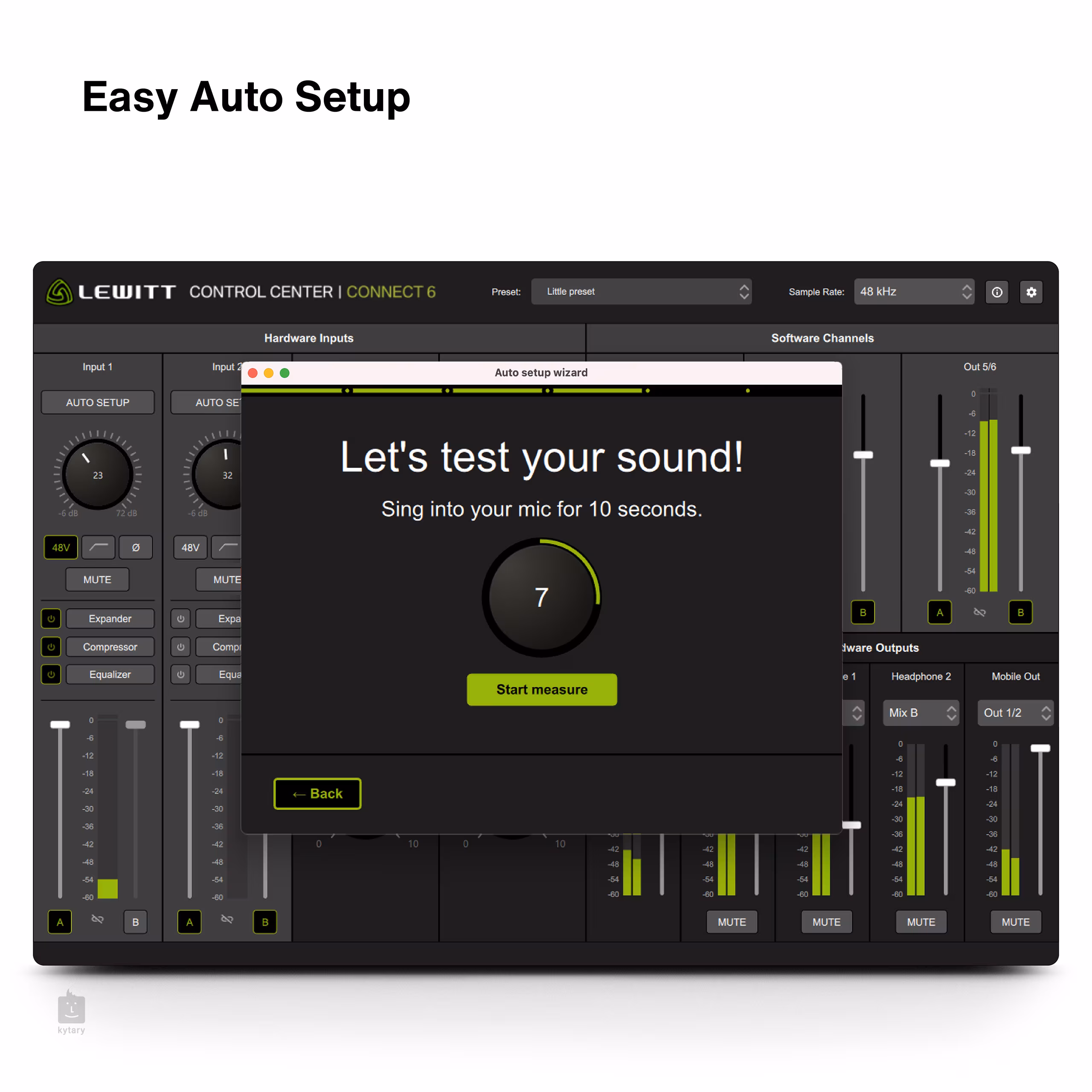 LEWITT Connect 6 je kompaktní USB-C zvuková karta přicházející v moderním elegantním designu, který bude vynikat na vašem stole. Jedná se o všestrannou zvukovku, kterou využijete pro nahrávání, streamování nebo hudební produkci. Přes USB-C kabel ji snadno zapojíte do svého počítače nebo smartphonu, ať už jste vyznavačem Apple zařízení nebo Androidu či Microsoftu. Zvuková karta je zároveň uživatelsky přívětivá, takže nebudete ztrácet čas dlouhým nastavováním. Stáhněte si software Control Center a ten udělá většinu práce za vás. Najdete zde funkci Autosetup, která vám v každé situaci pomůže nastavit optimální parametry a také integrované DSP (Digital Signal Processing) vybavené kompresorem, ekvalizérem a dalšími užitečnými funkcemi – svůj zvuk tak můžete rovnou upravovat bez použití DAW a využít nulové latence.