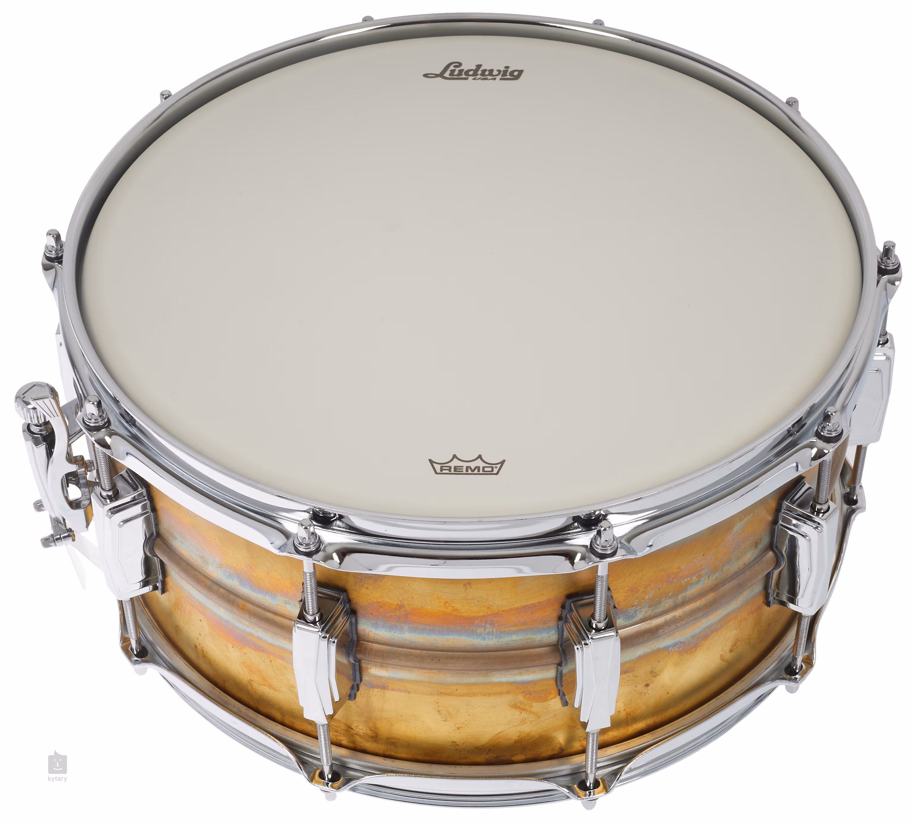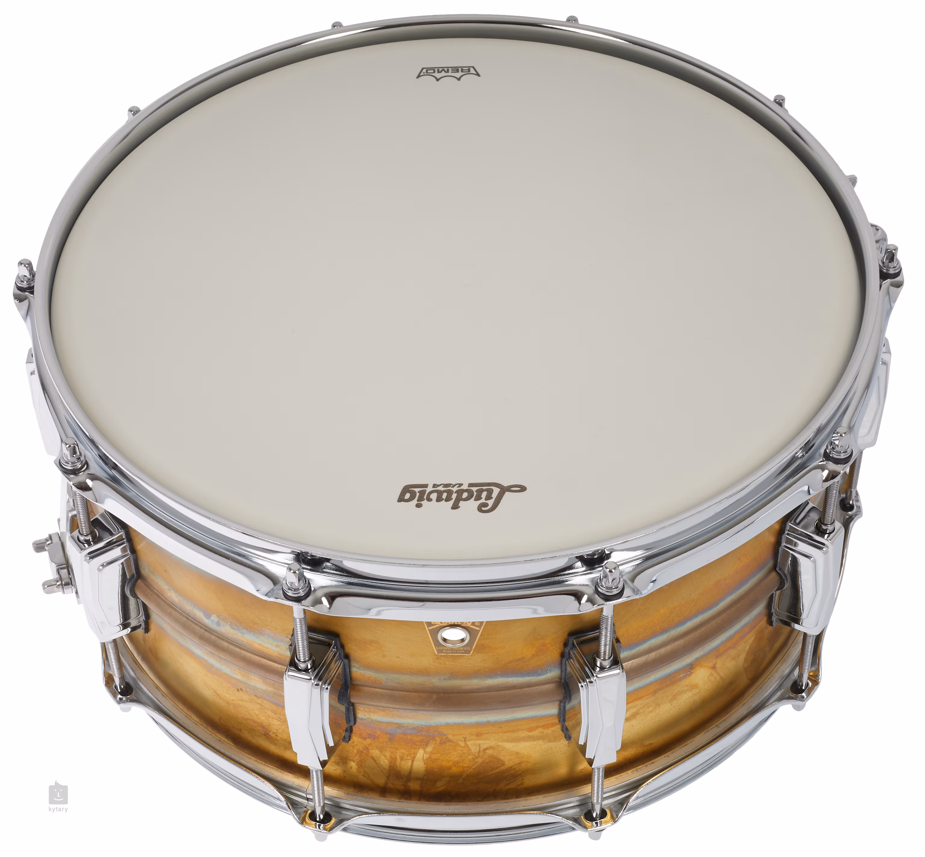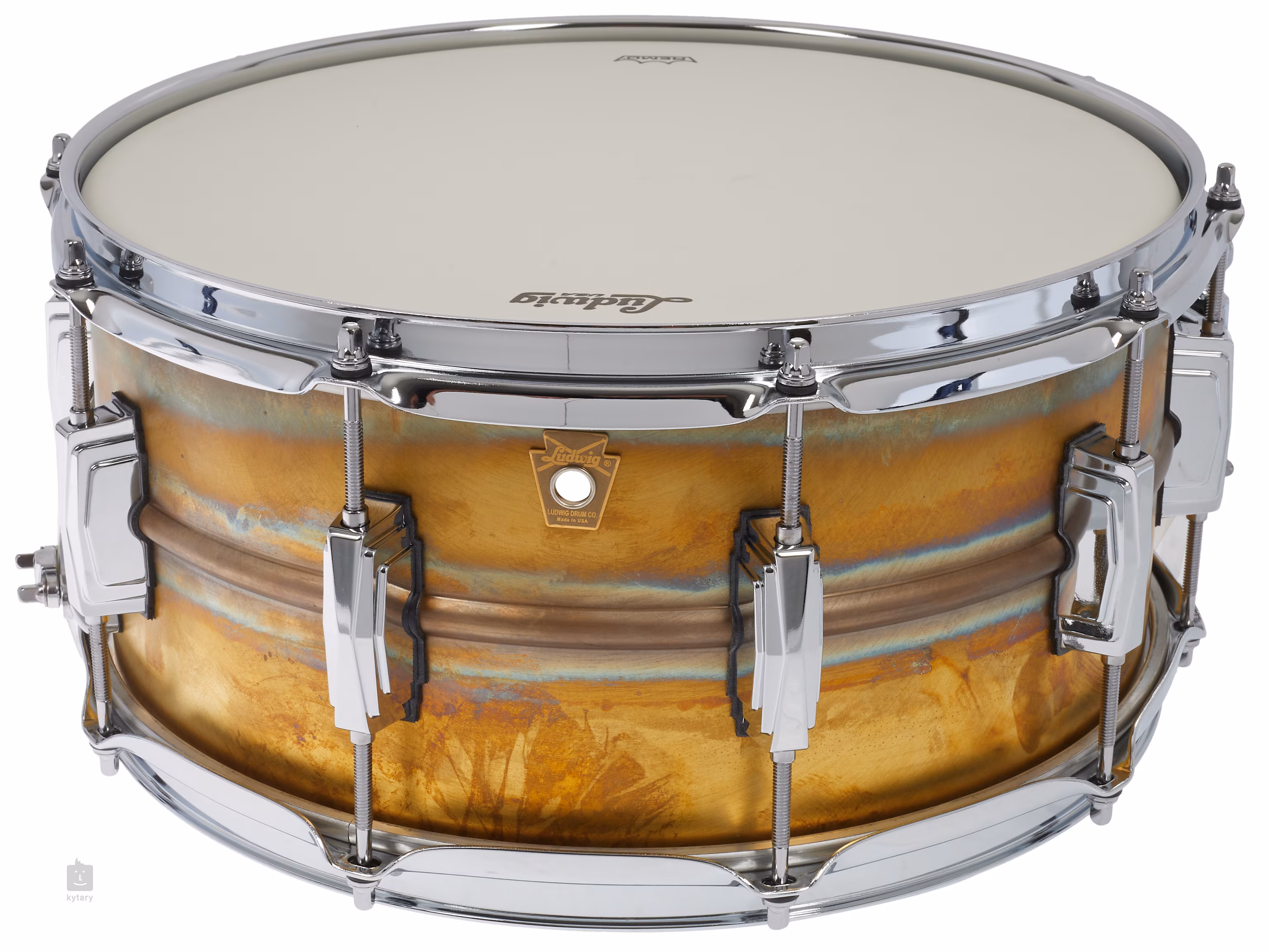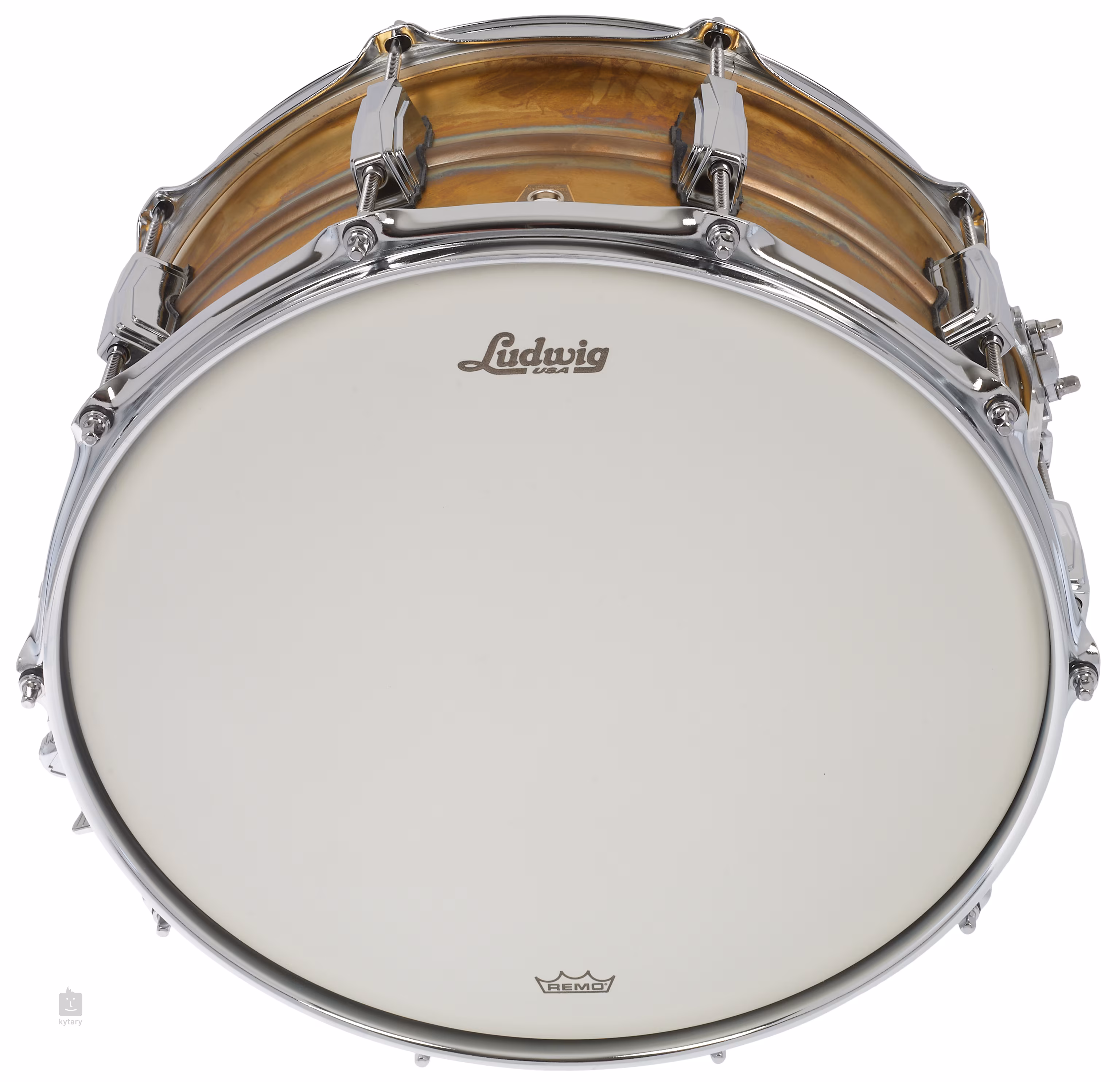 Ludwig 14" x 6,5" Raw Brass LB464R nabízí korpus zhotovený z 1,2 mm silné nelakované bezešvé mosazi, třikrát ohýbané ocelové obruče o síle 2,3 mm, mechaniku strunění P88AC Throw Off + P35P Butt Plate, deset mušlí (Imperial Lugs) a blány Ludwig Weather Master.