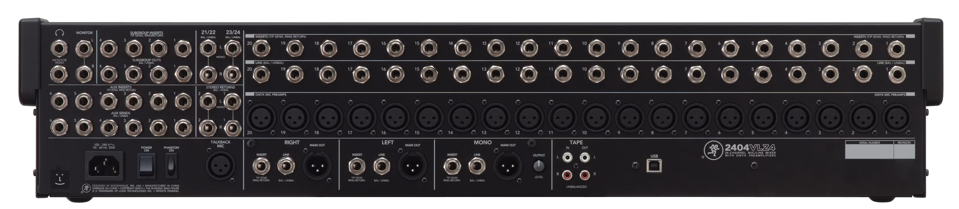 Konkrétně 2404-VLZ4 je kompaktní 24kanálový mixpult, který nabízí 20 linkových vstupů a 20 mikrofonních vstupů, kdy u mikrofonních jsou použity kvalitní předzesilovače Onyx, které můžete znát z nejvyšších řad Mackie. Ty nabízí až 60 dB rozsah gainu, díky čemuž je možné v dynamickém rozsahu dostat až na 128,5 dB. Zajišťují to nejvěrnější zesilení signálu na všech frekvencích a minimální úroveň zkreslení. Samozřejmě nabízí i phantomové napájení při použití kondenzátorových mikrofonů. U 2404-VLZ4 lze použít i nástrojové vstupy, díky kterým nebudete potřebovat žádné DI boxy.