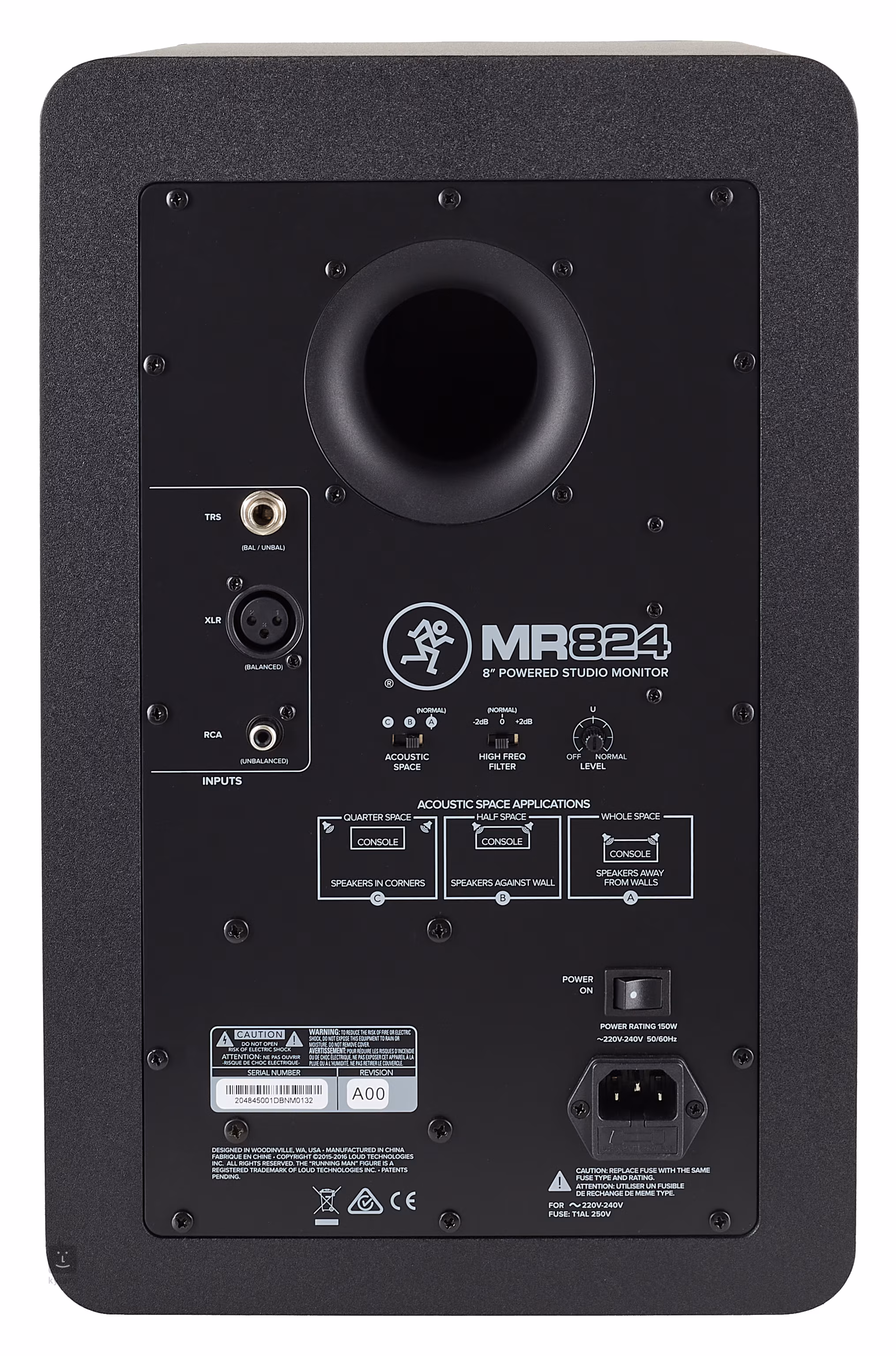 V dřevěném šasi Mackie MR824 se ukrývá 8" basový reproduktor disponující skvělou dynamikou v nízkých frekvencí a 1" výškový reproduktor, který zajistí co nejčistší zvuk a maximální srozumitelnost všech detailů. Zesilovač třídy A/B potom zajistí maximální výkon až 150 W. Zadní strana nabízí RCA, XLR a Jack 6,3 mm vstup pro vaše zařízení, třípolohový přepínač vysokých frekvencí (-3 až 3 dB), přepínač akustického prostoru pro co nejkvalitnější poslech a ovladač hlasitosti vstupního signálu. Monitory jsou plně kompatibilní s aktivním subwooferem Mackie MRS10, který dodá zvuku ještě větší sílu.