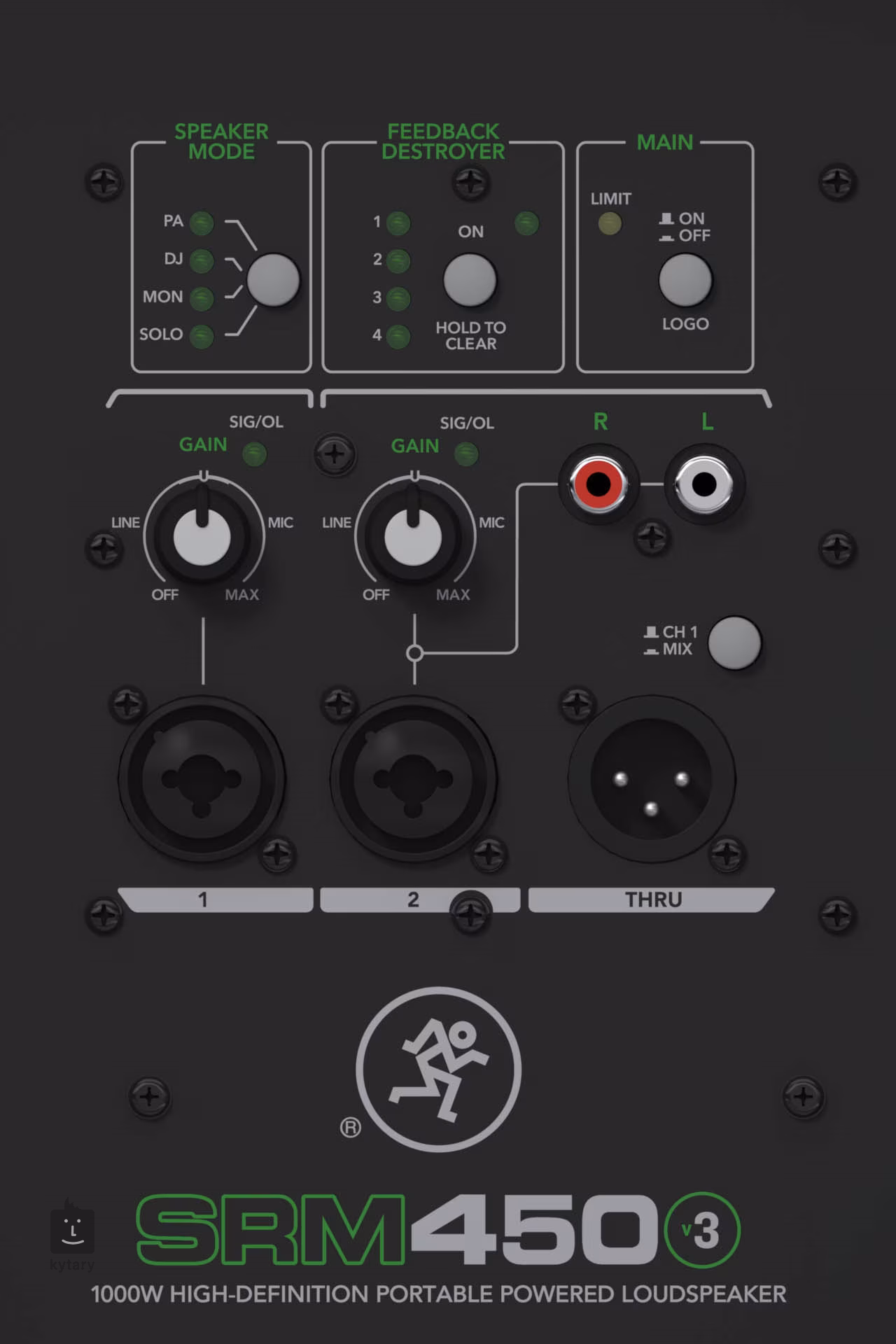 Na zadním panelu SRM naleznete dva XLR vstupy, dva 6,3mm Jack vstupy a jeden RCA spolu s paralelním XLR Thru výstupem. Též je zde dva ovladače hlasitosti, každý na jeden kanál, a dva přepínače, které upravují celkový charakter zvuku a nastavení anti-feedback systému. Celý systém pak chrání zabudovaný limiter.