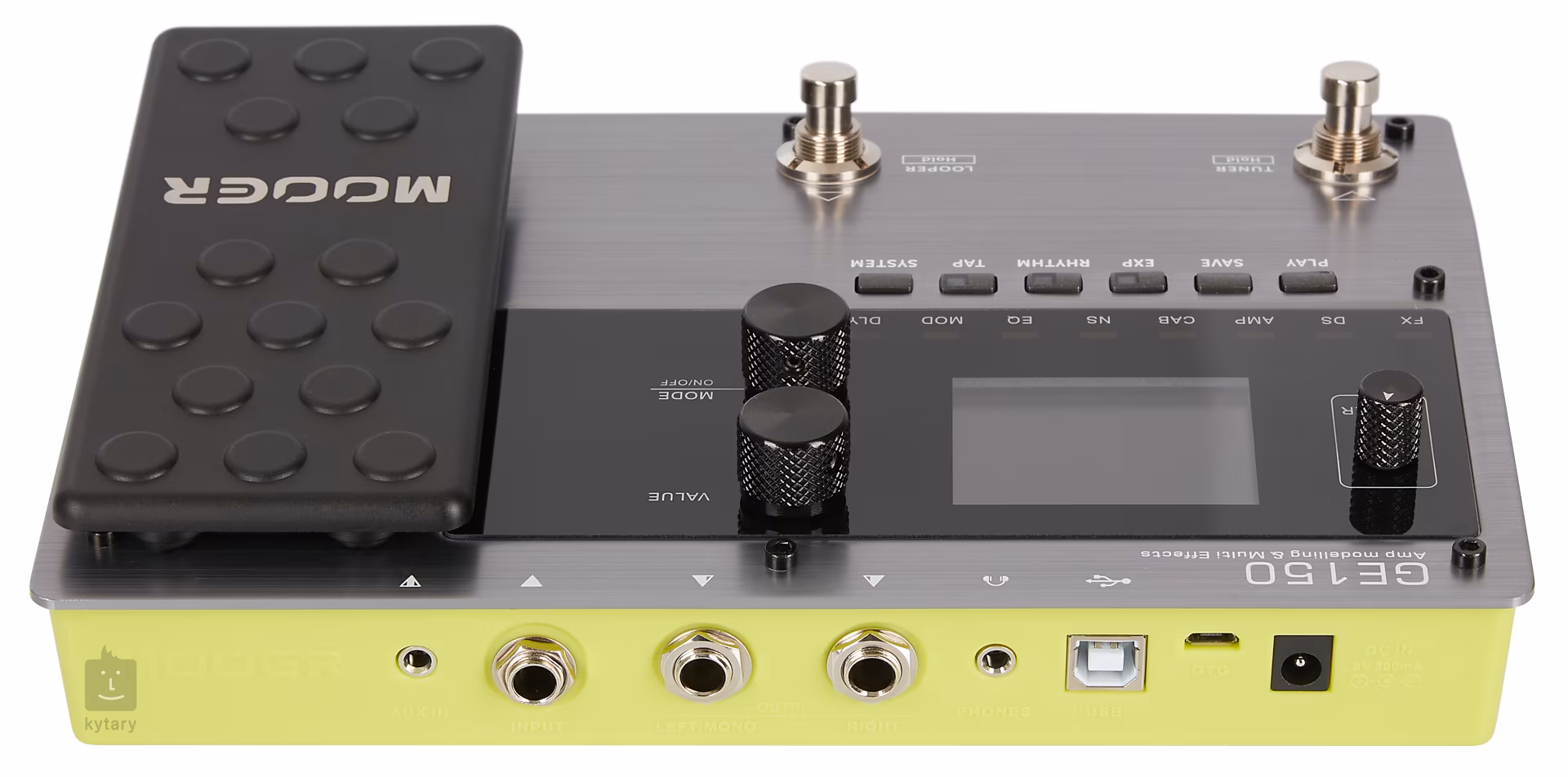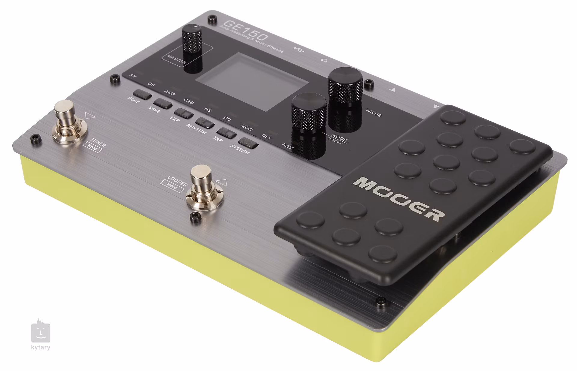 MOOER GE150 je kytarový multiefekt s integrovaným expression pedálem, který je vybavený technologií amp modeling. Nabízí celkem 151 kvalitních kytarových efektů a 55 simulací kytarových aparátů, ke kterým se snadno dostanete přes intuitivní uživatelské rozhraní s digitálním displejem. Rytmická sekce poskytuje vestavěný metronom s 10 volitelnými režimy a 40 rytmických patternů bicích nástrojů. Zařízení umožňuje tvorbu a ukládání až 200 uživatelských presetů.