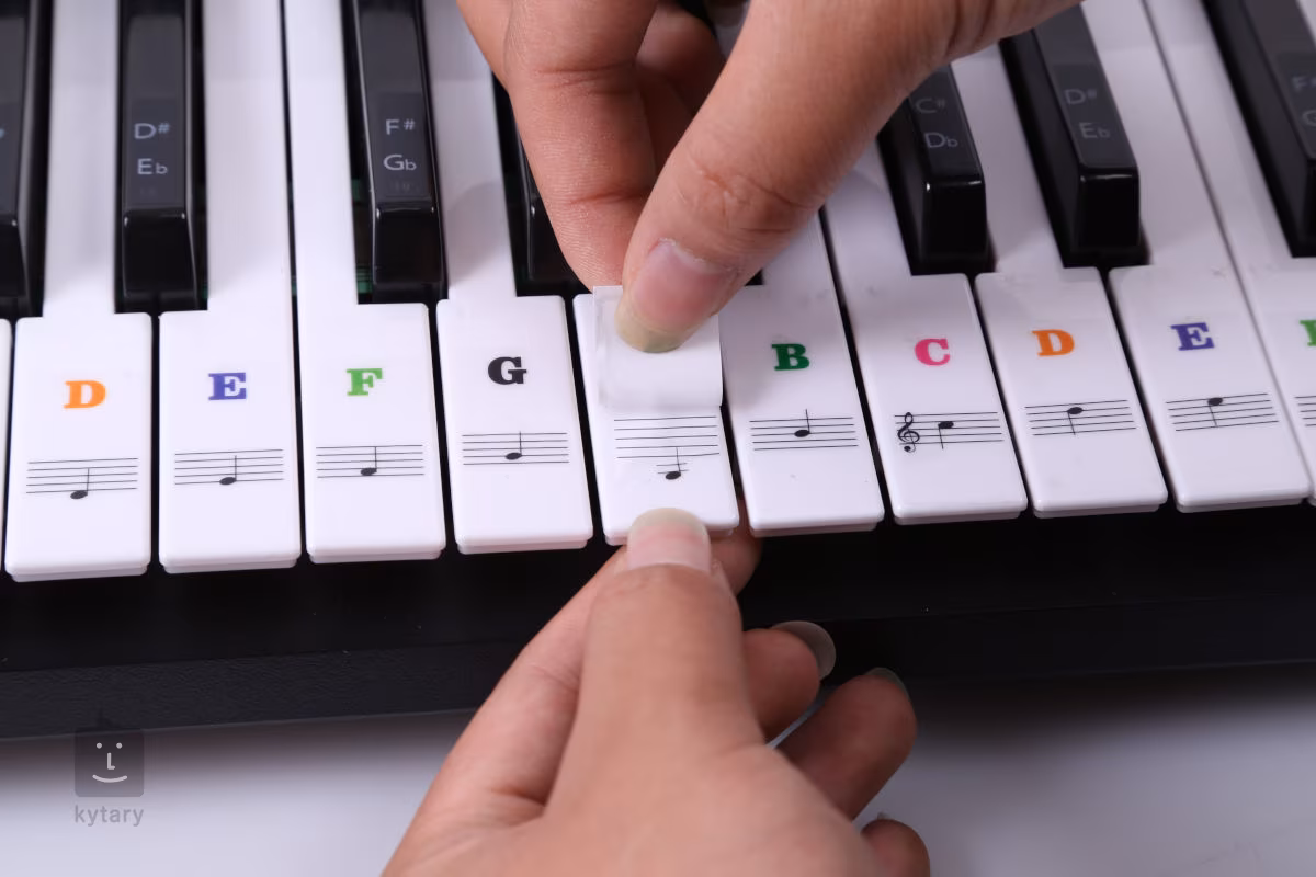 Samolepky s tóny vhodné pro začínající klavíristy, kteří teprve poznávají krásu svého nástroje, a to včetně teorie a hudební nauky. Balení obsahuje 88 samolepek obsahujících barevně odlišené názvy tónu spolu s usazením do notové osnovy. Samolepky jsou vyrobeny z odolného a velmi transparentního PVC materiálu, proto vydrží i několik let hraní a vám tak učení půjde jedna báseň.