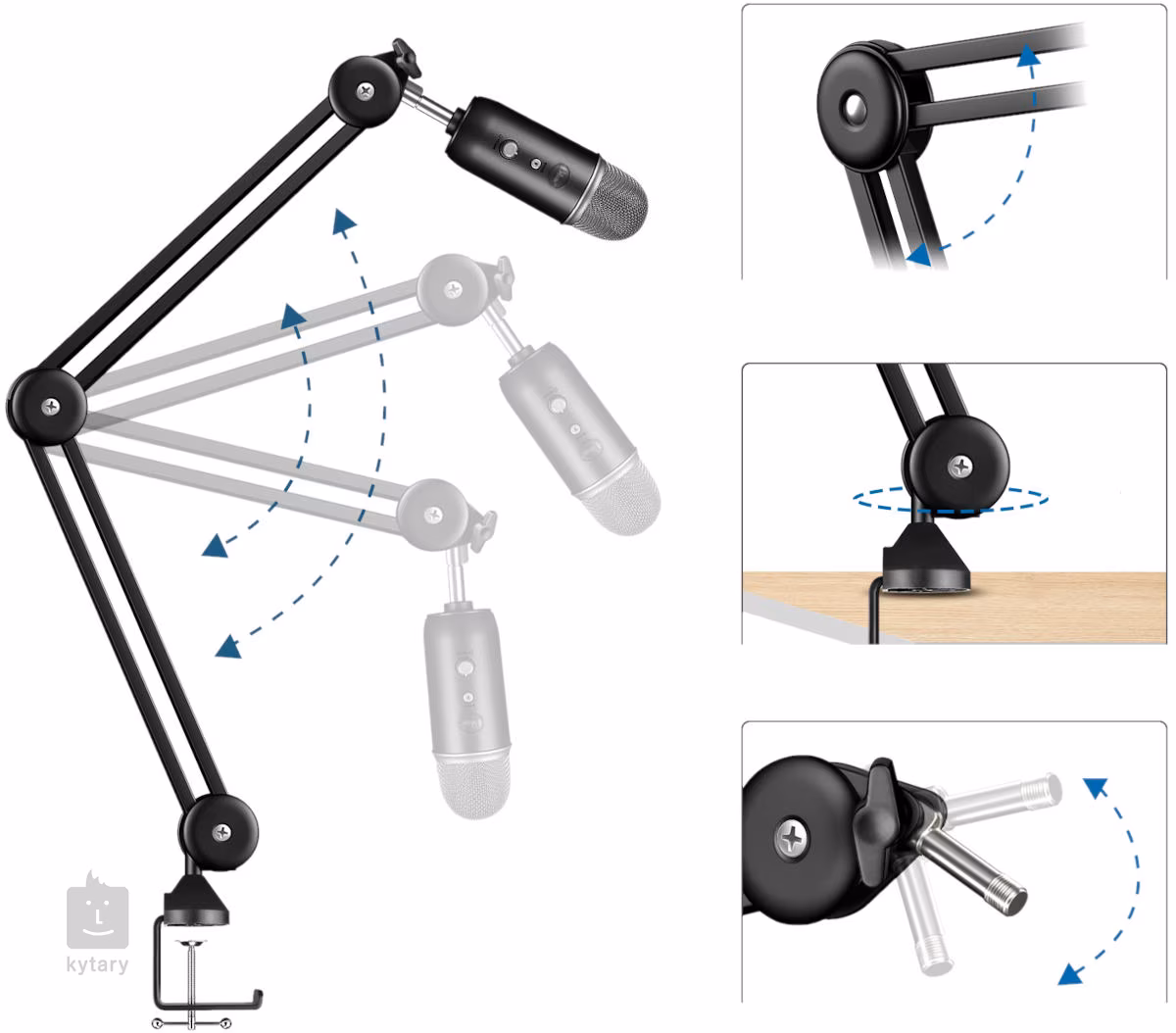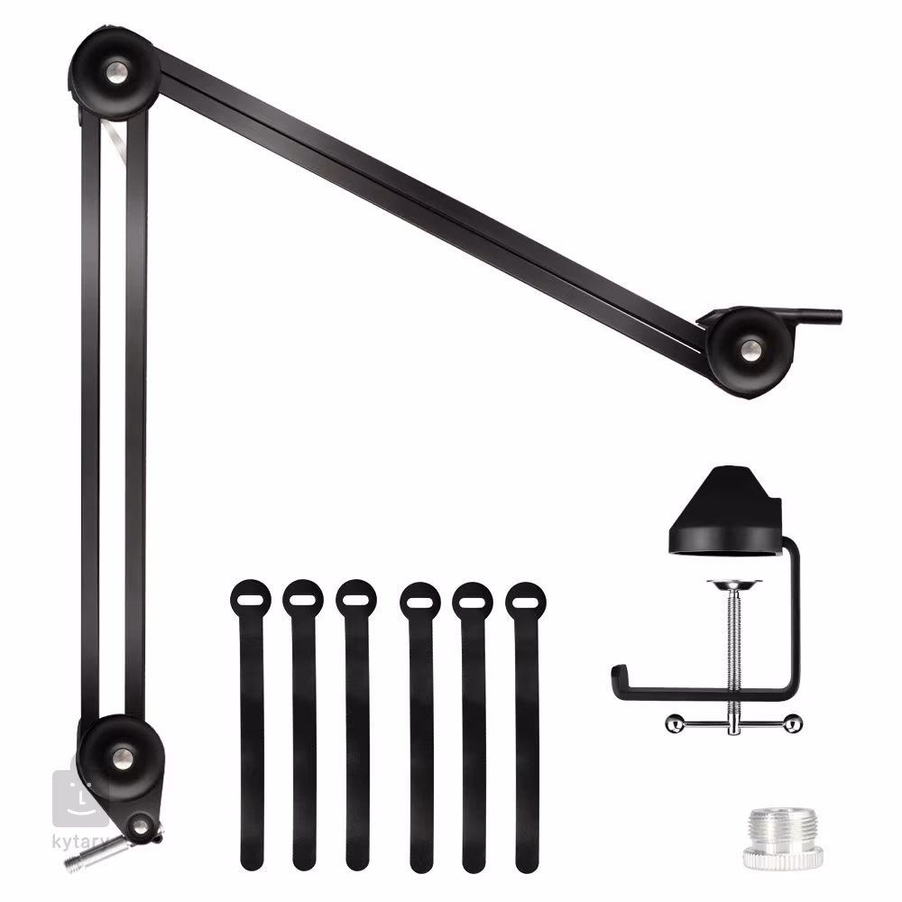 Prémiový stolní mikrofonní stojan vhodný pro živé rádiové vysílání, nahrávání dabingu, nebo tvorbu originálních videí na váš Youtube kanál. Na mikrofonní držák umístíte všechny typy mikrofonů, robustní kovové rameno unese váhu až 1,2 kg, navíc s ním lze bez problému otáčet o 360°. Lehká a odolná konstrukce vám umožní snadné uskladnění či přemístění stojanu na jakékoli místo ve vašem domácím studiu. Díky protiskluzové svorce můžete umístit držák na stůl o tloušťce až 60 mm s hladkým nebo lesklým povrchem. Součástí balení je závitová redukce a šest Velcro pásků pro dokonalý kabelový management.