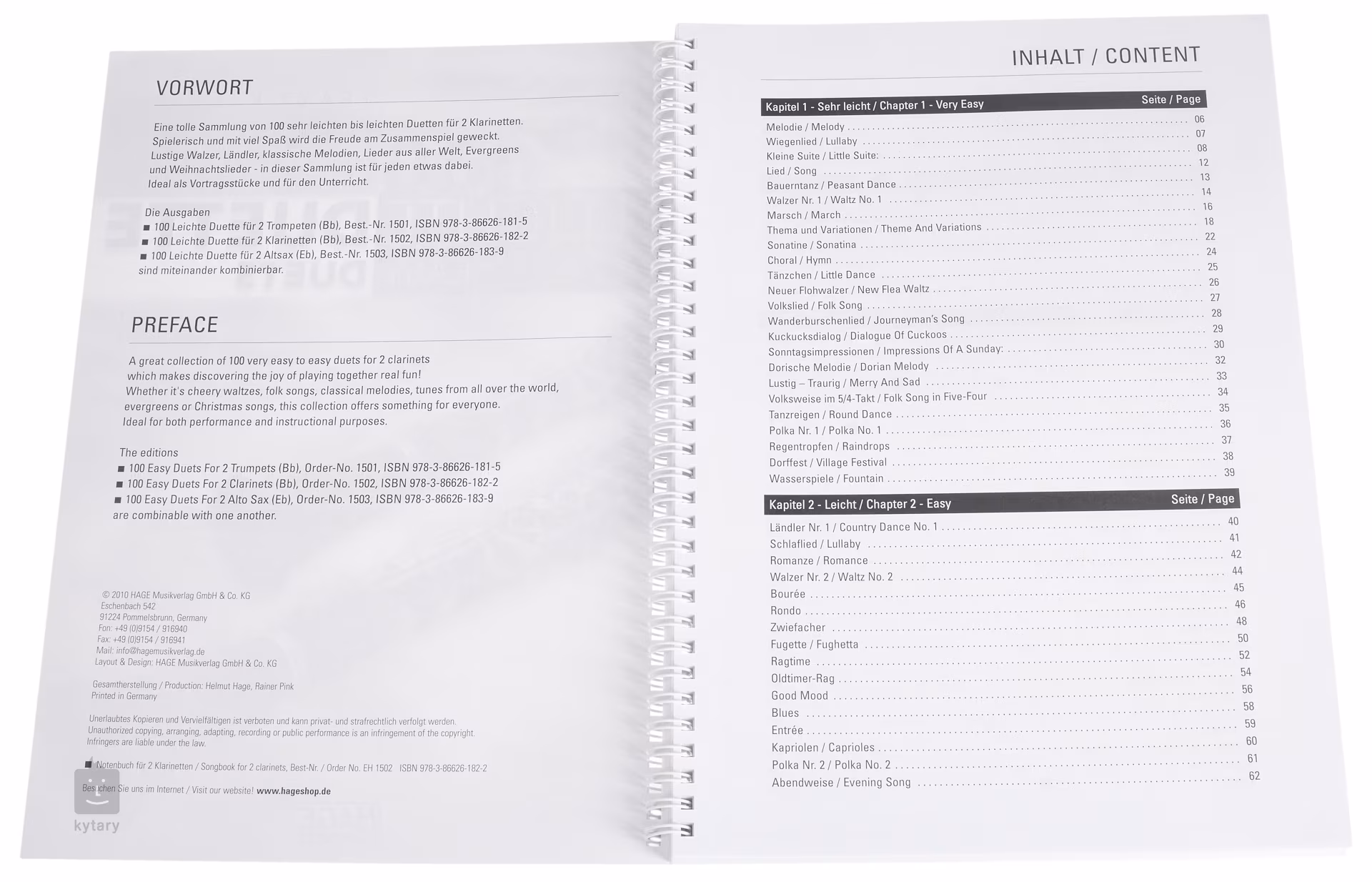 Tato publikace obsahuje výběr ze 100 duetů v lehkých úpravách pro dva klarinety. Valčíky, lidové písně, melodie z děl klasické hudby, evergreeny z celého světa i vánoční písně/koledy – ze stovky skladeb si vybere každý. Aranže skladeb jsou vhodné pro zpestření výuky i pro vystupování.