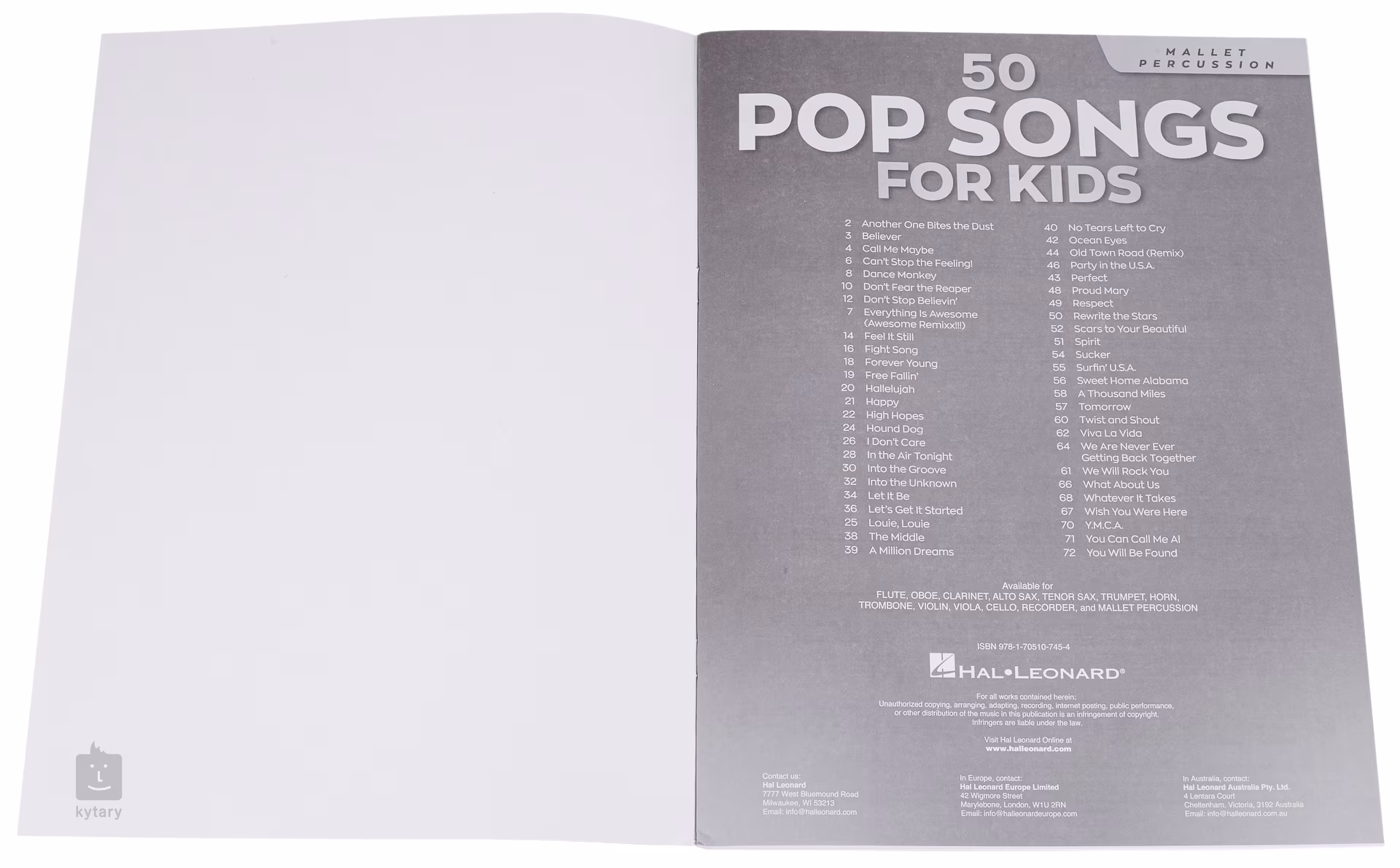 Když se děti učí na hudební nástroj, tak chtějí hrát především skladby, které znají a milují. Tímto heslem se řídí i publikace 50 Pop Songs for Kids obsahující sbírku padesáti současných hitů populární hudby v lehkých úpravách pro melodické bicí nástroje (xylofon, vibrafon, marimbu např.). Mezi skladbami nechybí Believer • Don't Stop Believin' • Happy • High Hopes • Let's Get It Started • Ocean Eyes • Perfect • Rewrite the Stars • A Thousand Miles • You Will Be Found • a další.