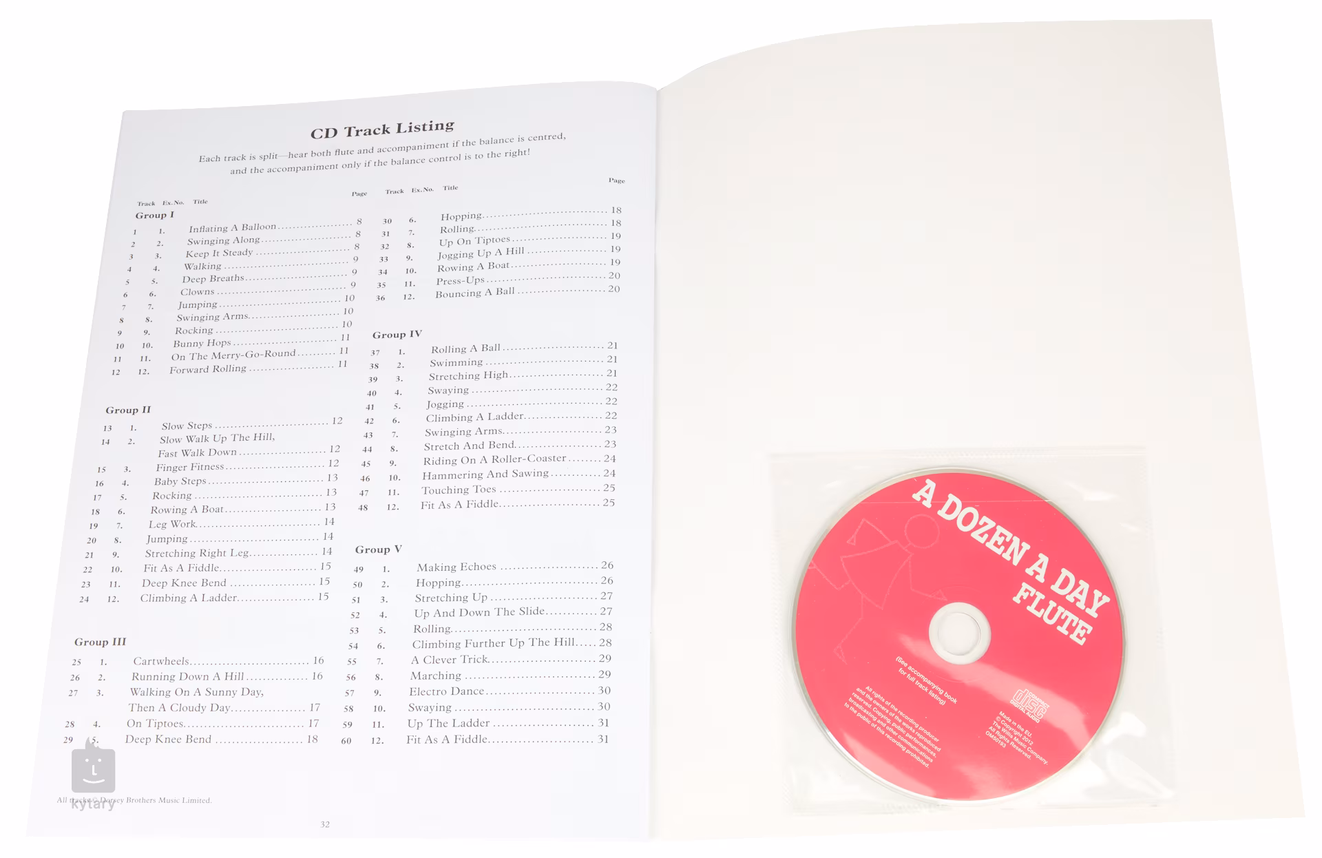 Publikace A Dozen A Day – Flute nabízí praktická cvičení na rozehřátí a rozhýbání prstů před hraním pro hráče na příčnou flétnu, která vám pomohou rozvinout a udržet po celou dobu hry správné návyky, tj. prstoklad a práci s dechem. Přiložené audio CD obsahuje hudební doprovody ke cvičením.