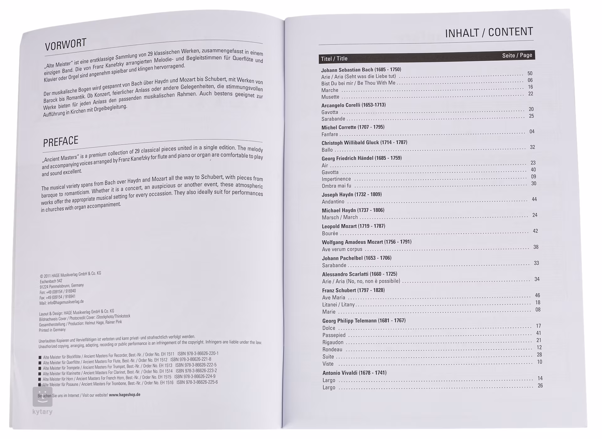 Publikace Ancient Masters obsahuje 29 známých skladeb klasické hudby (období baroka, klasicismu a ranného romantismu) od hudebních velikánů jako Bach, Haydn, Vivaldi, Mozart, Schubert a dalších v úpravách pro sólovou příčnou flétnu s doprovodem aranžovaným pro klavír/varhany.
