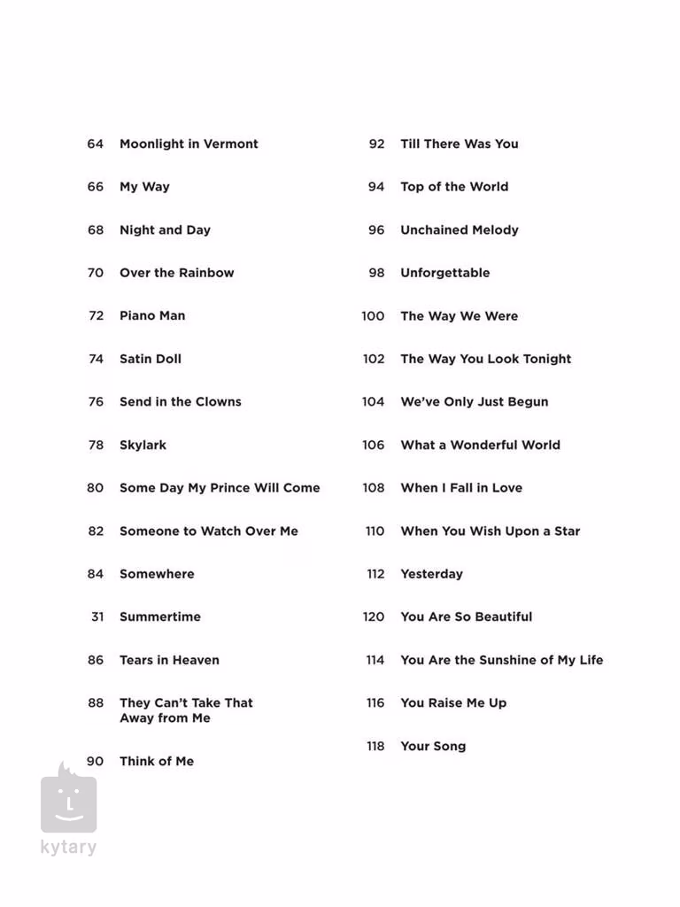 Seznam skladeb: 1. Crazy 2. At last 3. Always 4. Memory 5. All the Things You Are 6. Somewhere 7. My way 8. Hallelujah 9. Don't Stop Believin' 10. Top of the world 11. Imagine 12. You Raise Me Up 13. Summertime 14. Defying Gravity 15. Blue Skies 16. Body and Soul 17. Bohemian Rhapsody 18. Yesterday 19. Can't help falling in love 20. Candle in the Wind 21. Climb Ev'Ry Mountain 22. A Dream is a Wish Your Heart Makes 23. Just the way you are 24. Piano Man 25. Dust in the Wind 26. Unforgettable 27. Edelweiss 28. Every Breath You Take 29. Fly Me To The Moon (In Other Words) 30. Your song 31. Georgia On My Mind 32. Send In The Clowns 33. Here's That Rainy Day 34. I Dreamed A Dream 35. I'll Be Seeing You 36. Isn't It Romantic? 37. It Might As Well Be Spring 38. Let it Be 39. Love walked in 40. Moon River 41. Moonlight in Vermont 42. Night and Day 43. Over the Rainbow 44. Satin Doll 45. Skylark 46. Some Day My Prince Will Come 47. Someone to Watch Over Me 48. Tears in heaven 49. They Can't Take That Away from Me 50. Think of Me 51. Till There Was You 52. Unchained Melody 53. The Way We Were 54. The Way You Look Tonight 55. We'Ve Only Just Begun 56. What a Wonderful World 57. When I Fall In Love 58. When you wish upon a star 59. You are so beautiful 60. You Are the Sunshine of My Life