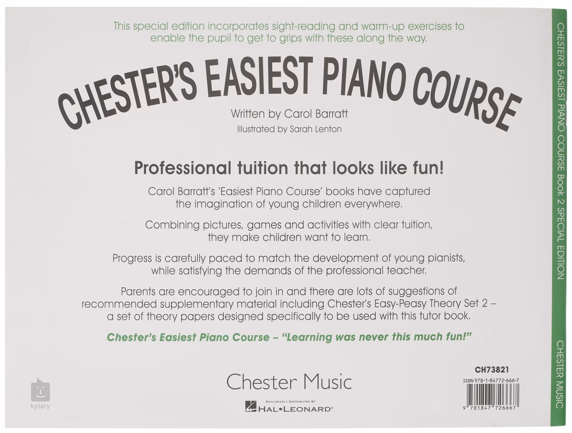 Klavírní škola pro děti Chester's Easiest Piano Course Book 2 začleňuje do výkladu materiály k procvičení hry z listu a cvičení na rozehrání. Publikace pomocí zábavných her a kvízů doplněných barevnými obrázky seznamuje děti se základy klavírní hry a teorie. Tempo výkladu je uzpůsobeno mladým pianistům a jejich postupnému rozvoji, zároveň vyhovuje i požadavkům učitelů na hudebních školách.