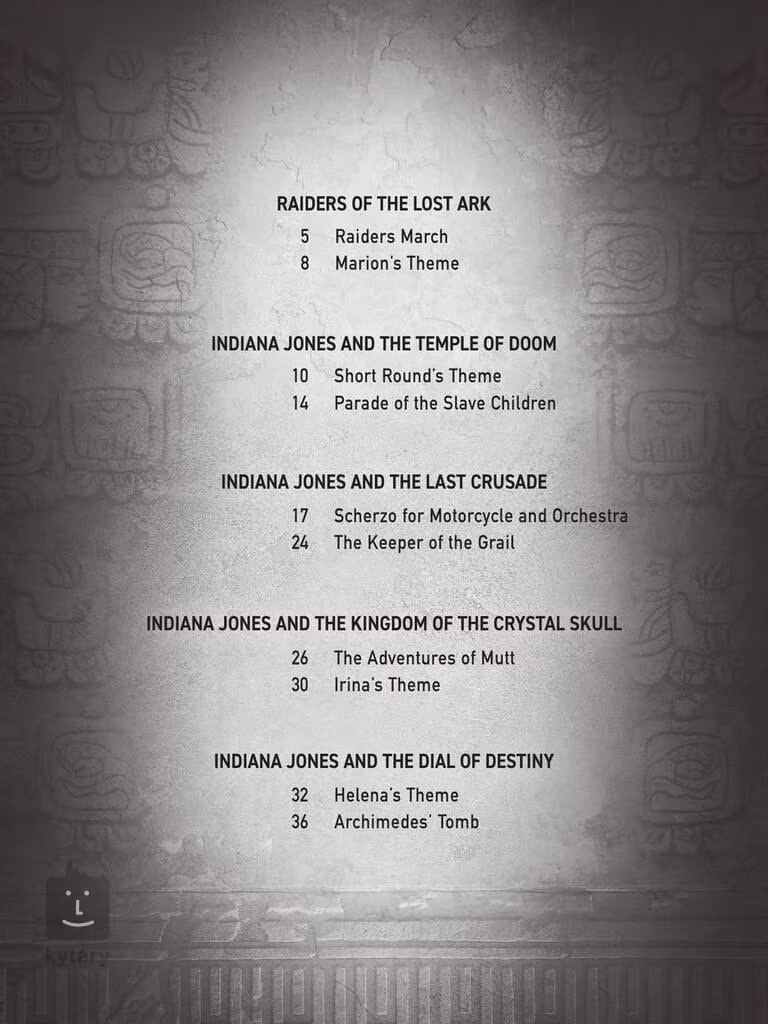 Připravte se na dobrodružnou cestu klaviaturou vašeho piana s publikací Indiana Jones Piano Solo Collection, která obsahuje deset oblíbených melodií z filmové série Indiana Jones. Každé téma je vypracováno v úpravě pro sólový klavír (úroveň pokročilý až více pokročilý) odsouhlasené samotným Johnem Williamsem.