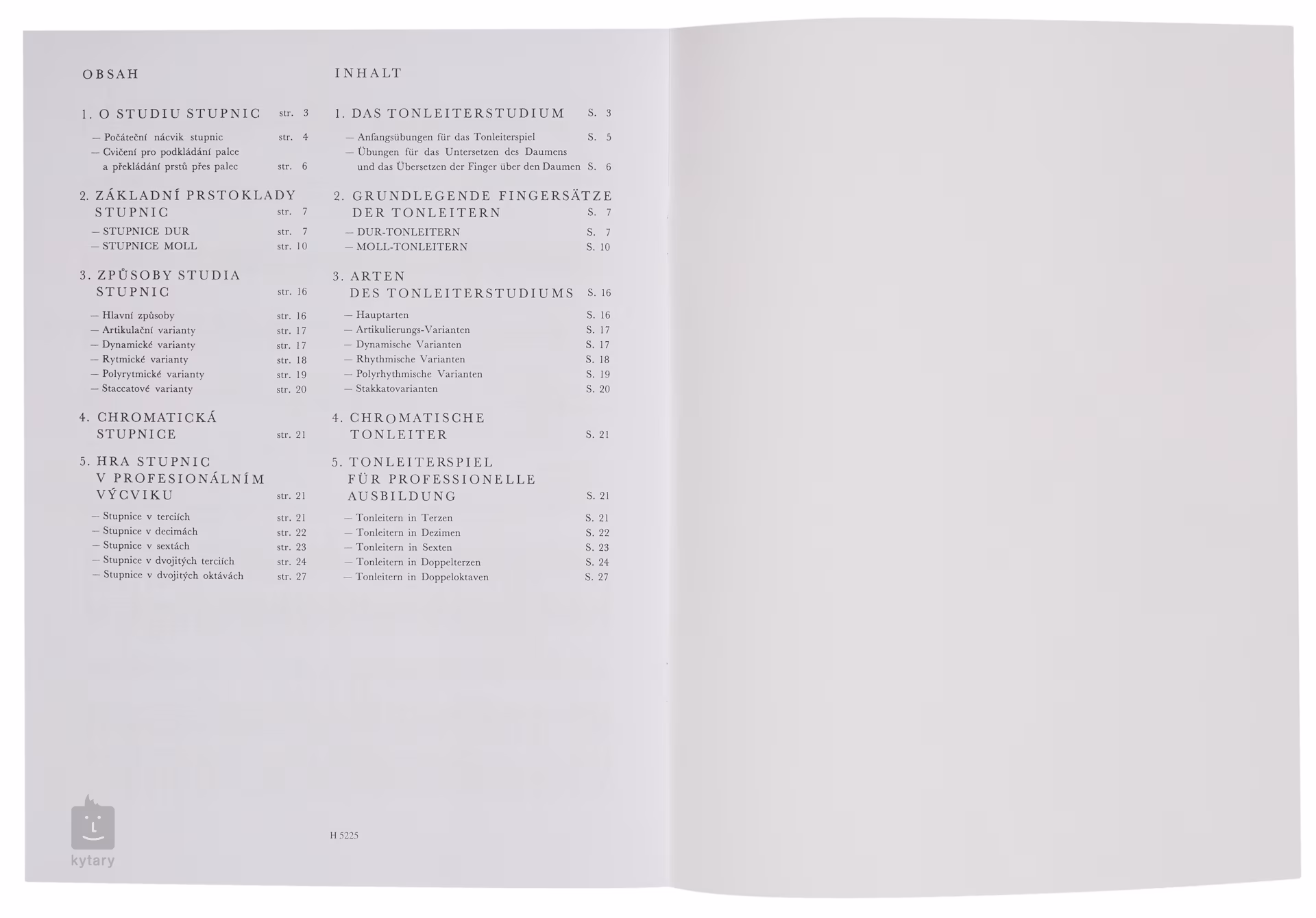 1. O studiu stupnic: Počáteční nácvik stupnic Cvičení pro podkládání palce a překládání prstu přes palec 2. Základní prstoklady stupnic: Stupnice dur Stupnice moll 3. Způsoby studia stupnic: Hlavní způsoby Artikulační varianty Dynamické varianty Rytmické varianty Polyrytmické varianty Staccatové varianty 4. Chormatická stupnice 5. Hra stupnic v profesionálním výcviku: Stupnice v terciích Stupnice v decimách Stupnice v sextách Stupnice v dvojitých terciích Stupnice v dvojitých oktávách