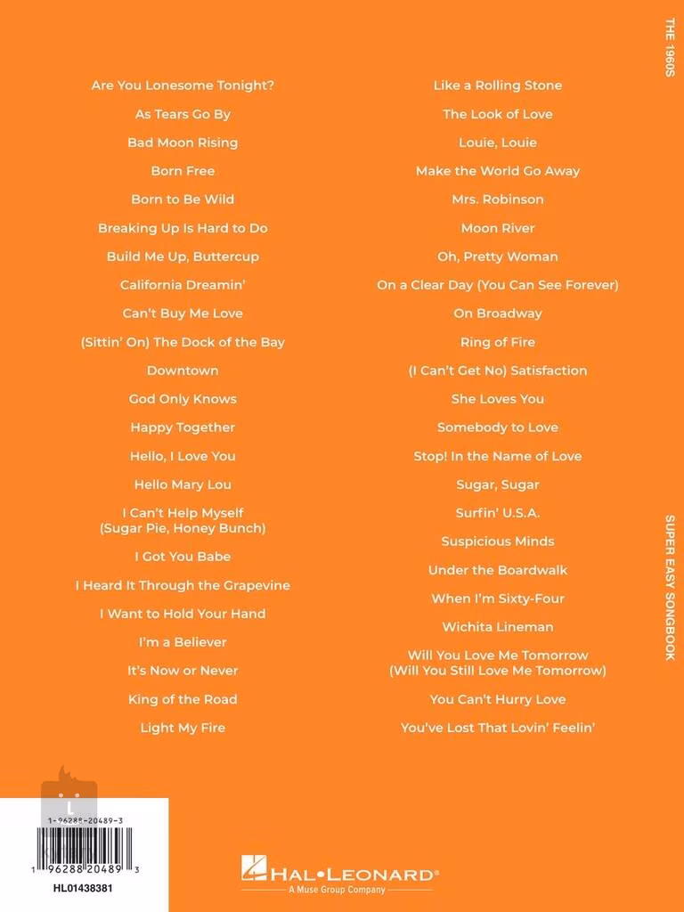 The 1960s - Super Easy Songbook nabízí 46 slavných skladeb ze šedesátých let minulého století ve velmi jednoduchých aranžích pro klavír. Publikace je vhodná pro začínající pianisty všech věkových skupin. Každá skladba obsahuje notový zápis melodie pro pravou ruku, znázorněné akordové doprovody pro levou ruku a text skladby, takže si jednotlivé písničky můžete u klavíru zazpívat.