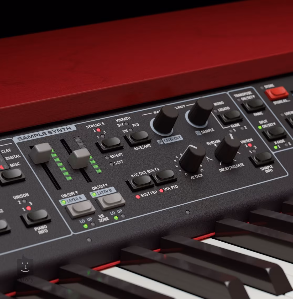 KLAVIATURA Nord Grand 2 je vybaven novou a vylepšenou kladívkovou klaviaturou Kawai s trojicí snímačů pro přesné sledování úhozu a pohybu kladívek, přičemž je zachováno její snadné používání, a stejně jako v případě původní klaviatury poskytuje mimořádnou kontrolu v celém dynamickém rozsahu. Novinkou je možnost kombinovat dvě zvukové vrstvy (klavír a syntezátor), takže nabízí větší flexibilitu při hraní a tvorbě zvuku. • nový design panelu s fadery a LED • nová kladívková mechanika s citlivou odezvou • Triple pedal 2 (součástí)