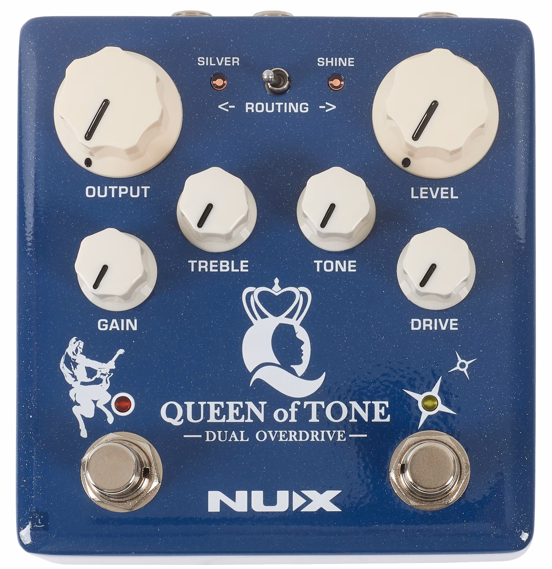Nux NDO-6 Queen of Tone nabízí v šasi pedálového efektu dva overdrive efekty Horseman a Morning Star. Horseman (s mody Gold a Silver) vychází ze známého efektu Centaur, Morning Star je inspirován slavným Bluesbraker obvodem s krásně transparentním low gain overdrivem. Pořadí efektů v signálové cestě nastavíte přepínačem Routing, dalšími přepínači volíte mezi true bypass a buffered bypass zapojením nebo standardním vstupním signálem a vyšší hladinou IFS (Input Fet Stage).