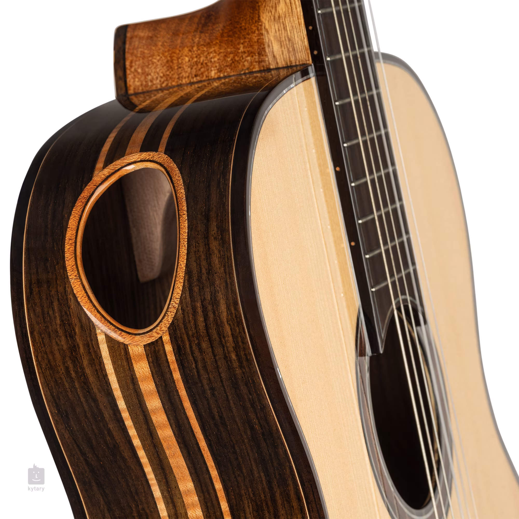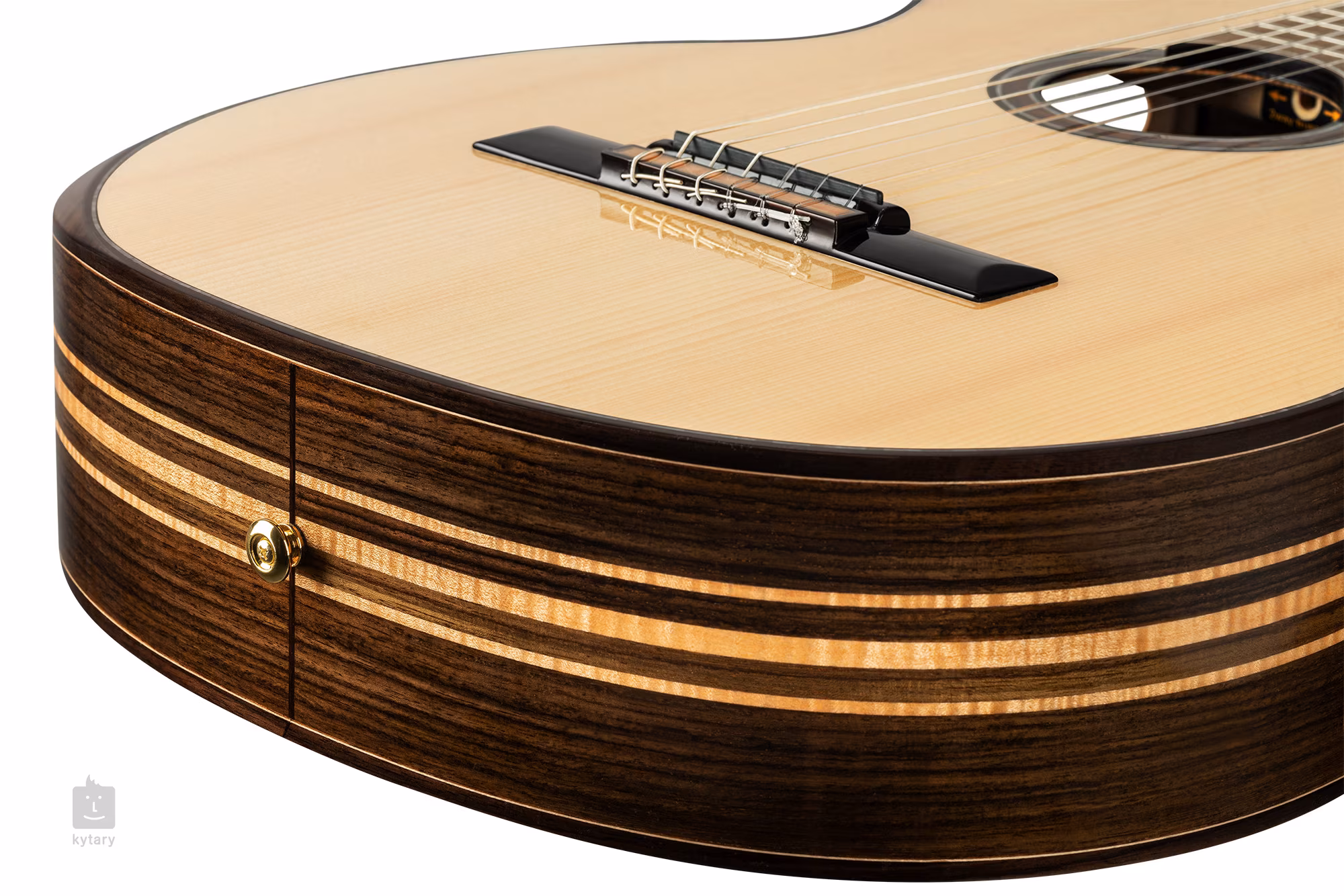 Přední deska klasické kytary Grandsuite 4/4 NAT je zhotovena z masivu evropského smrku. Zadní desku a luby z vrstveného palisandru dekorují proužky z fládrovaného javoru. Mnozí jistě ocení i moderní prvek v podobě druhého ozvučného otvoru v lubu kytary.