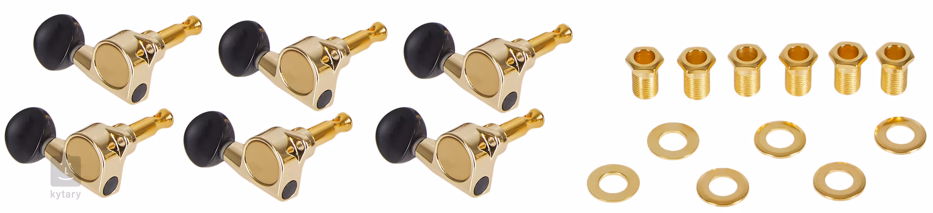 Ladicí mechaniky pro elektrickou kytaru. Jsou vyrobeny z kovu ve zlaté povrchové úpravě, kolíčky jsou z odolného černého plastu. Vhodné pro nástroje se šesti mechanikami v jedné řadě.