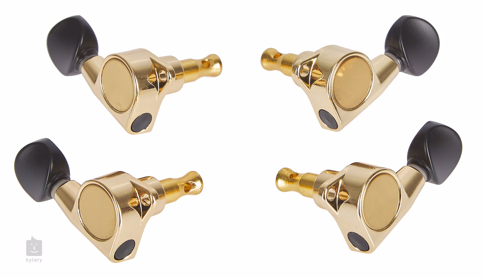 Die-Cast ladicí mechaniky pro ukulele. Jsou vyrobeny z litého kovu ve zlaté povrchové úpravě s kolíčky z odolného černého plastu.