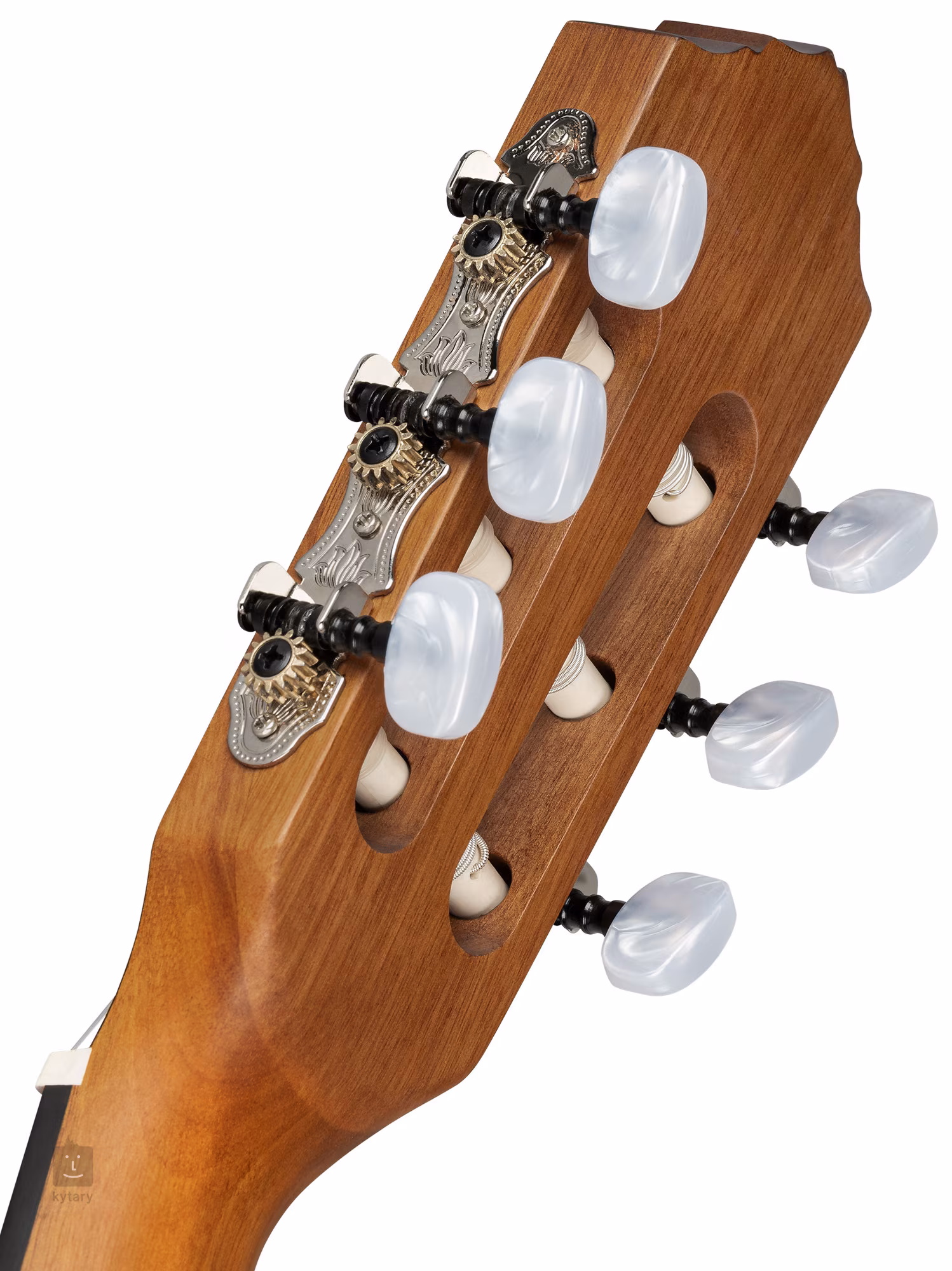 Struny jsou uchyceny v klasických otevřených mechanikách s kolíčky z imitace perleti a ořechové kobylce se dvanácti otvory. Stylové zpracování podtrhuje lemovka z plastového materiálu ABS a dekorativní rozeta.