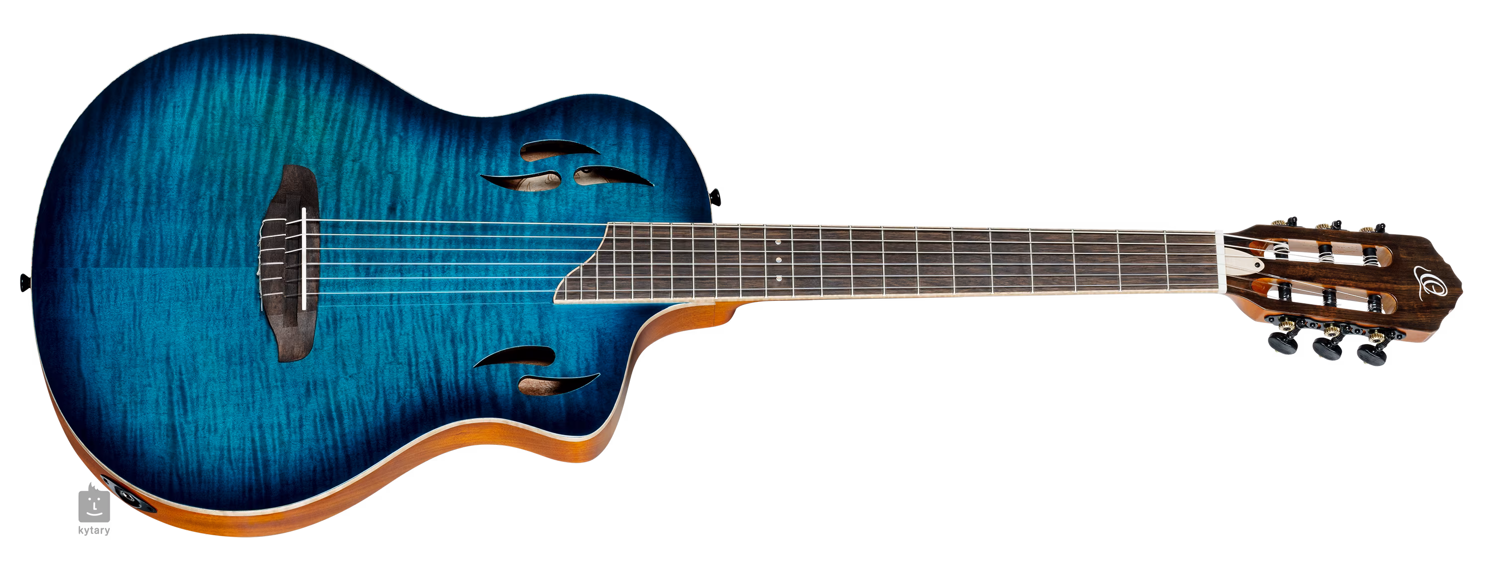 Možnost ozvučení nabízí aktivní elektronika Ortega MagusX/G s třípásmovým ekvalizérem a zabudovanou ladičkou. Struny jsou přes nultý pražec z kosti uchyceny v klasických ladících mechanikách v černém provedení a kobylce z fíkovníku. Pěkné zpracování podtrhuje lemovka těla a hmatníku z fládrovaného javoru, perleťové poziční tečky na dvanáctém pražci a barevná úprava topu Gloss Blue Burst.