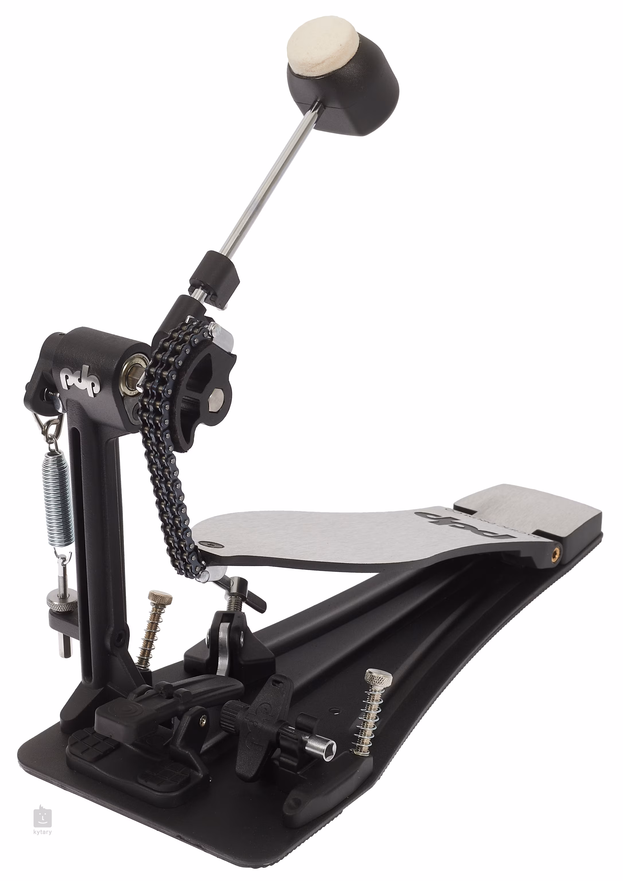 PDSPCO Single Pedal Concept Series je rychlý a responzivní single pedál k basovému bubnu s řetězovým double-chain převodem, lineární vačkou, dvoustranným beaterem, nastavením sklonu beateru, hladkým povrchem footboardu s integrovaným pantem s jehlovými ložisky a masivní ocelovou základnou s magnetickým ladícím klíčem.