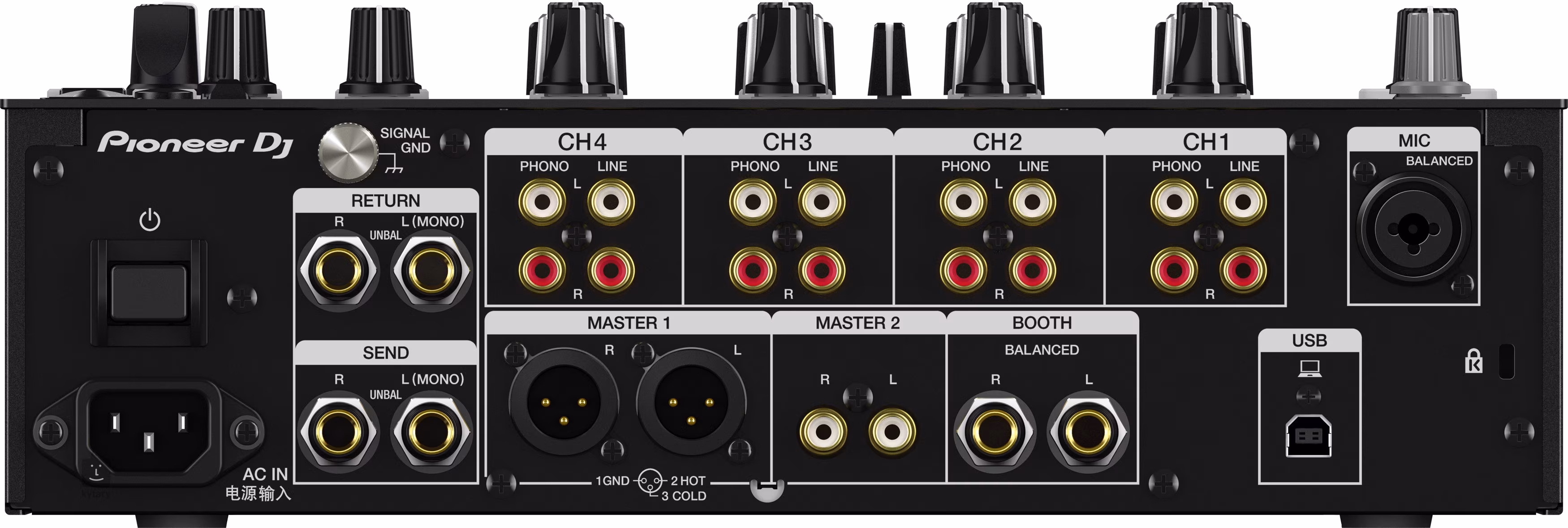 XLR, RCA (master), 1x RCA (S/PDIF), 1x RCA (Rec), 2x Jack 6,3 mm TS (booth), 2x Jack 6,3 mm TS (send)
