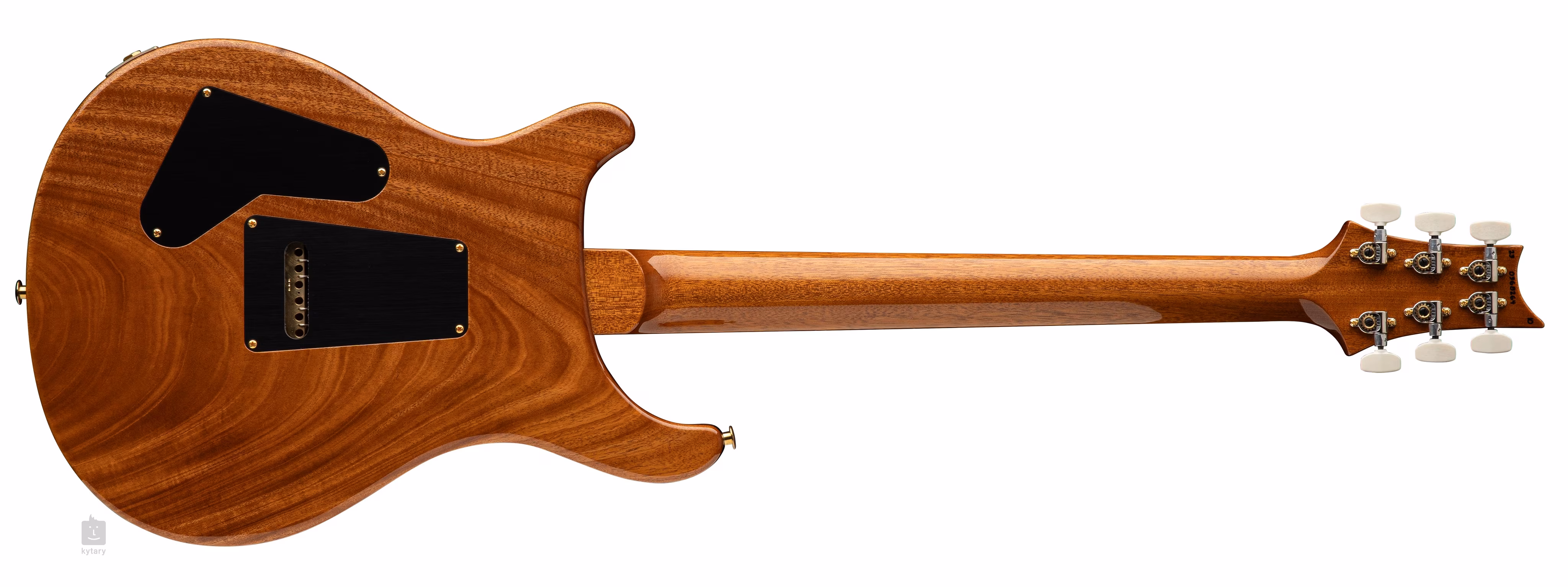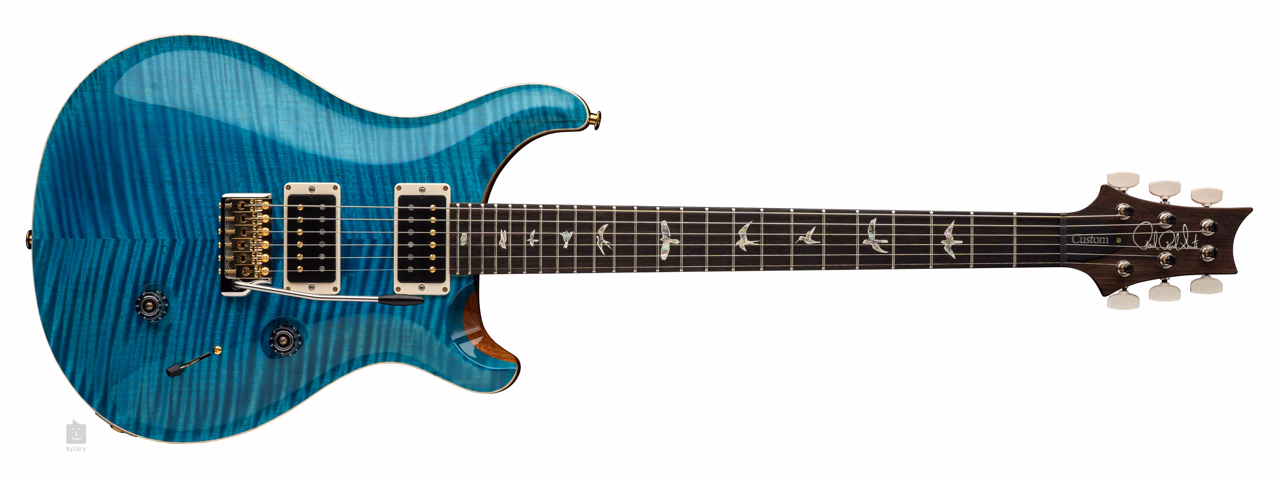 Model Custom 24 Carroll Blue už na první pohled upoutá kombinací ergonomicky tvarovaného mahagonového těla s typickým dvojitým PRS výřezem a topu z figurovaného javoru s parádní kresbou dřeva. Ke krku z jednoho kusu mahagonu s profilem Pattern Thin je přilepen palisandrový hmatník osazený čtyřiadvaceti pražci. Orientaci na hmatníku usnadňují trademark PRS polohové značky v podobě perleťových ptačích siluet.
