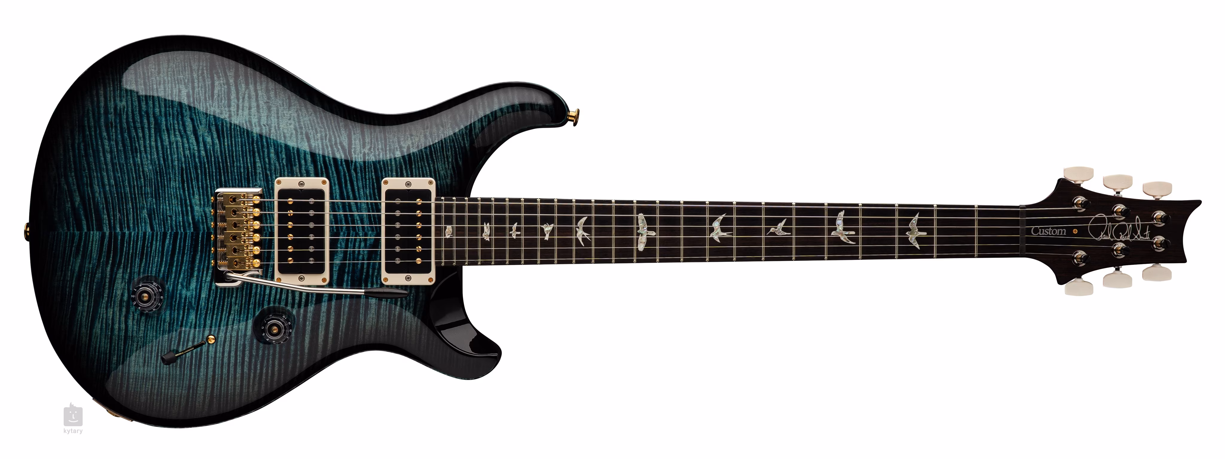 Model Custom 24 Cobalt Smokeburst už na první pohled upoutá kombinací ergonomicky tvarovaného mahagonového těla s typickým dvojitým PRS výřezem a topu z figurovaného javoru s parádní kresbou dřeva. Ke krku z jednoho kusu mahagonu s profilem Pattern Thin je přilepen palisandrový hmatník osazený čtyřiadvaceti pražci. Orientaci na hmatníku usnadňují trademark PRS polohové značky v podobě perleťových ptačích siluet.