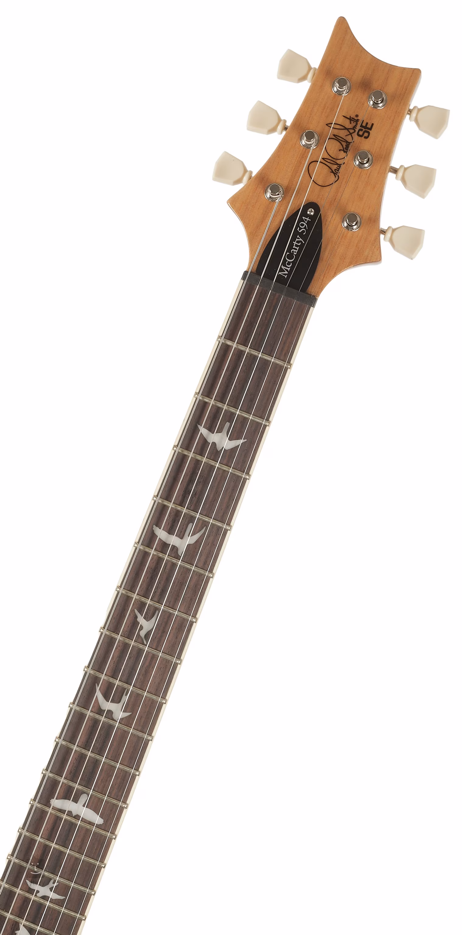 Mahagonové tělo double-cut kytary SE McCarty 594 Turquiose zdobí javorový top a efektní dýha z fládrovaného javoru. Výřez Shallow Violin carve přibližuje kvalitou herní vlastnosti nástroje k dražším americkým modelům série Core. K mahagonovému krku s profilem Pattern Vintage je přilepen lemovaný palisandrový hmatník osazený dvaadvaceti pražci. Samozřejmostí je kratší menzura kytary (625 mm) zakotvená v označení modelů McCarty 594 (24.594 palců). Orientaci na hmatníku usnadňují polohové značky v podobě ptačích siluet.