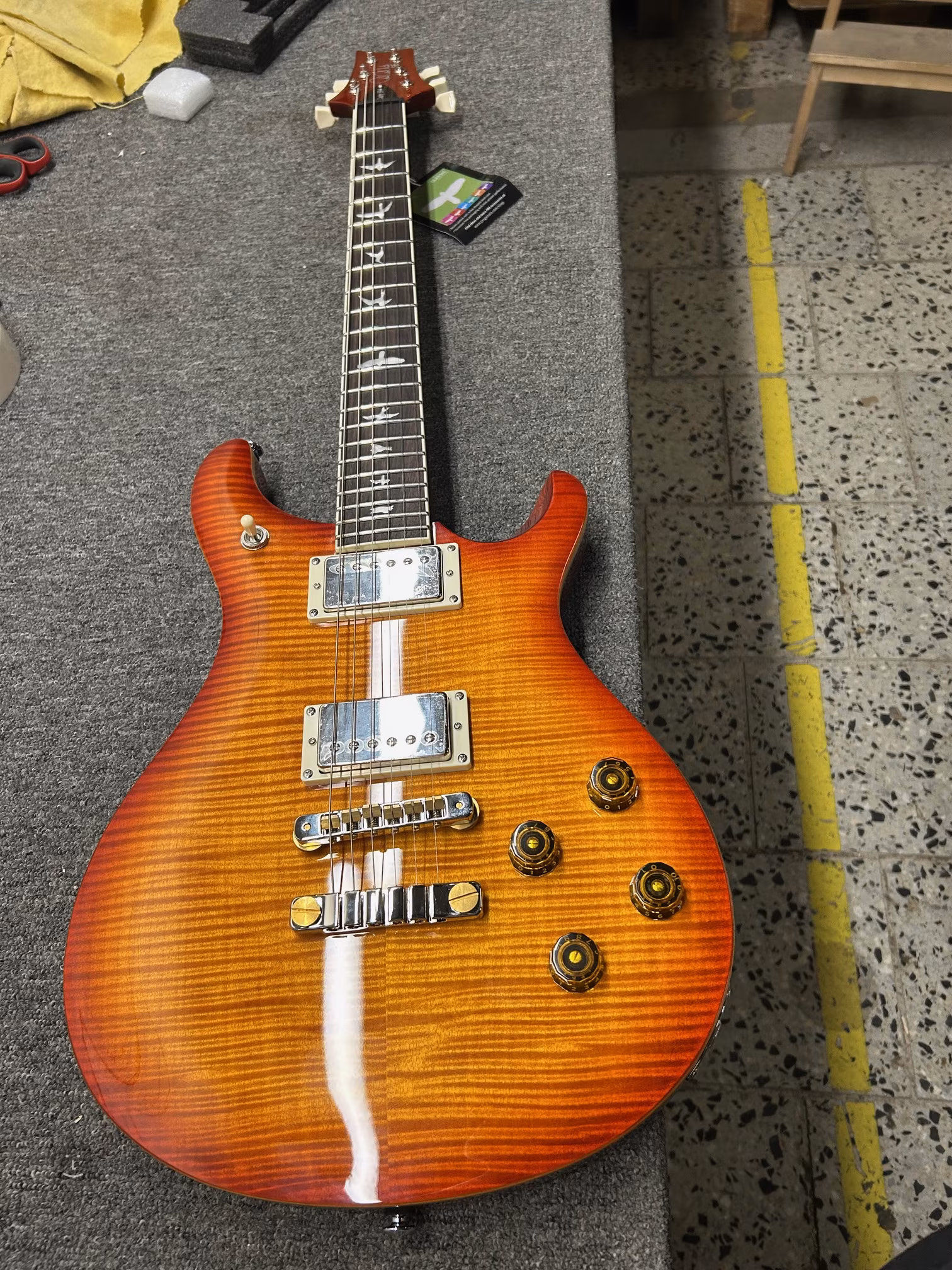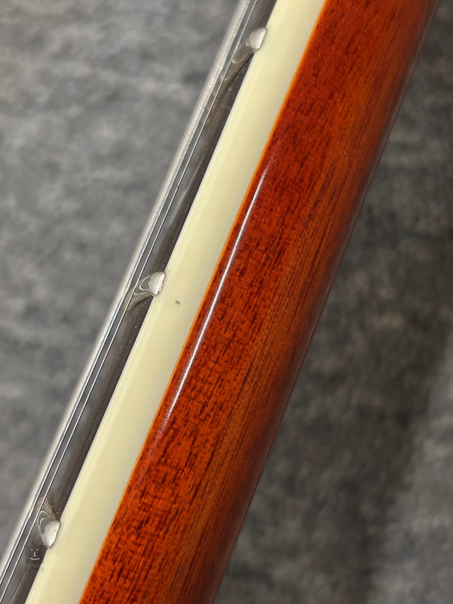 Drobná vada v laku z výroby na spodní straně krku pod 3. pražcem (viz foto).