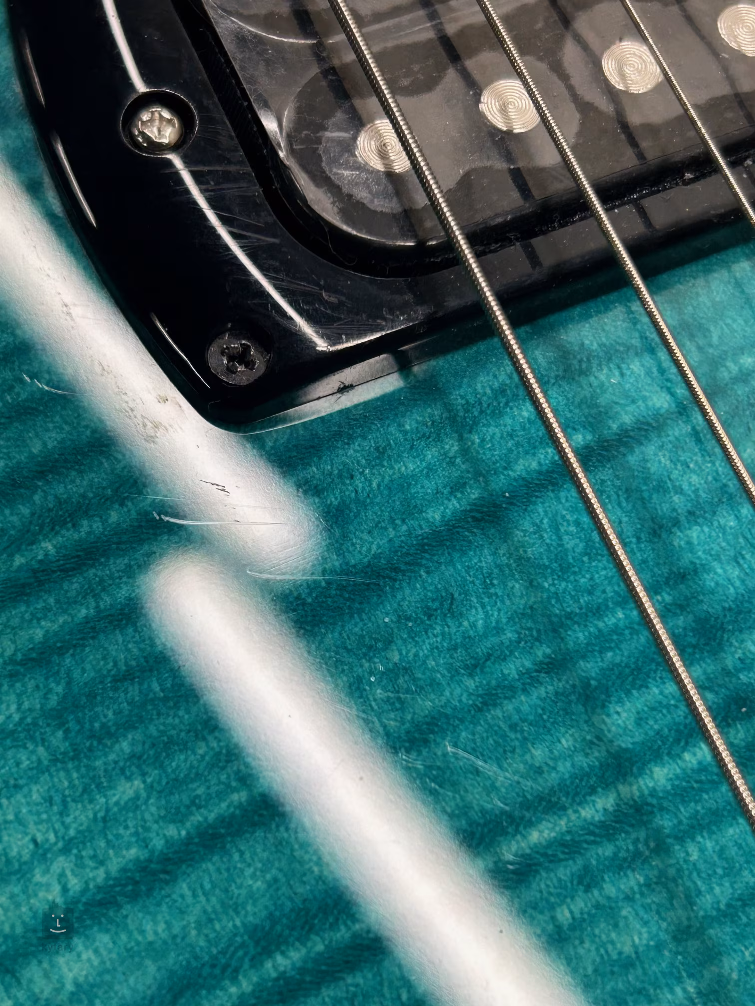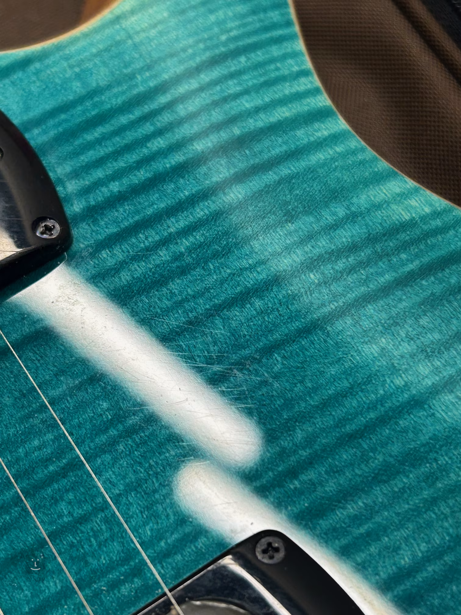 Elektrická kytara SE Paul's Guitar Turquiose už na první pohled upoutá ergonomicky tvarovaným mahagonovým tělem s typickým dvojitým PRS výřezem, vyřezaným javorovým topem a působivou vrchní dýhou z fládrovaného javoru. Výřez Shallow Violin carve přibližuje kvalitou herní vlastnosti nástroje k dražším americkým modelům série Core. K mahagonovému krku s profilem Wide Fat je přilepen palisandrový hmatník osazený dvaadvaceti pražci a vyzdobený tradičními PRS polohovými značkami s ptačími siluetami.
