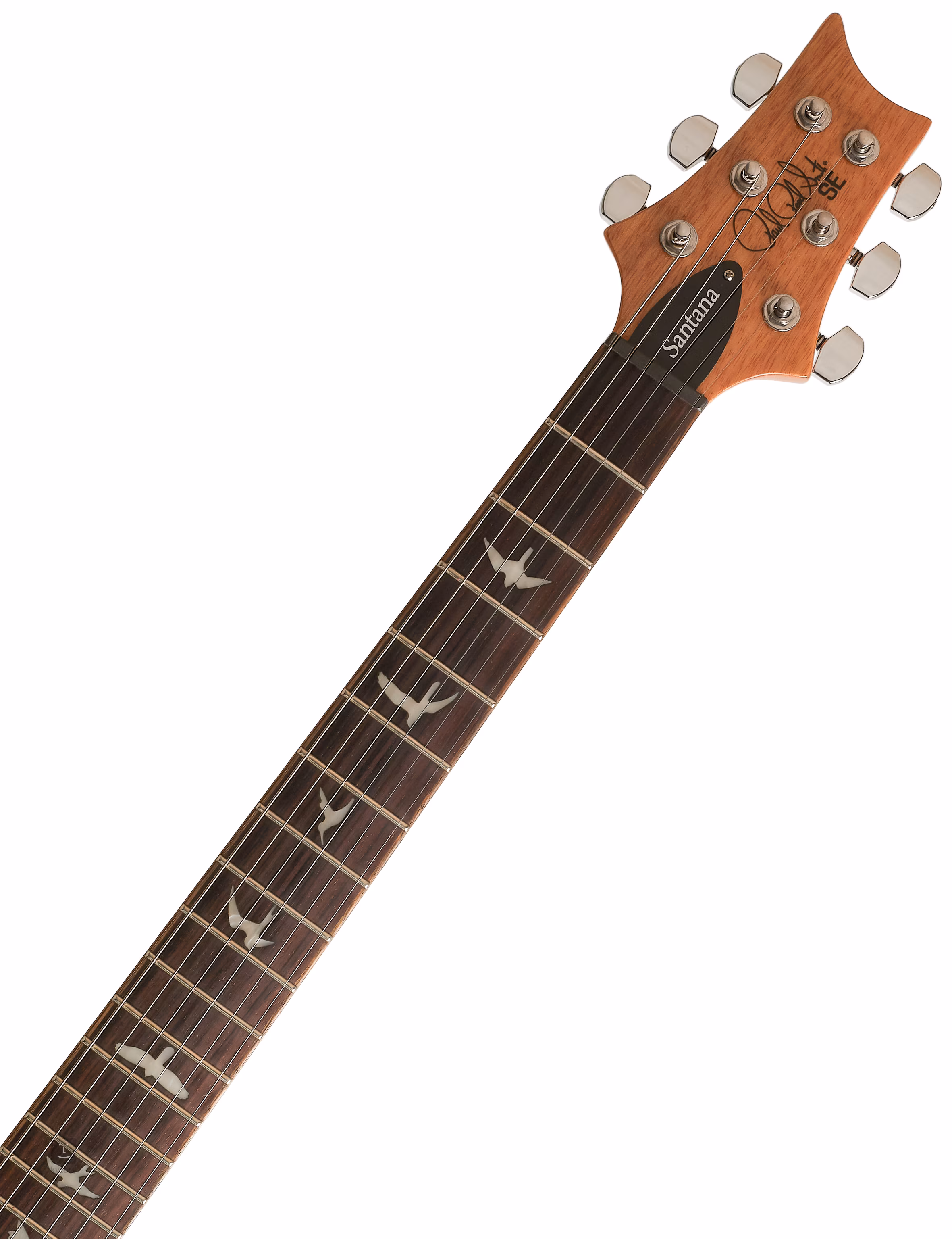 Kytary PRS z dílny Paula Reeda Smithe platí za jedny z nejuniverzálnějších a nejspolehlivějších nástrojů vůbec. Díky skvělému zvuku a hernímu komfortu si je oblíbili například Santana nebo Mark Tremonti. Elektrická kytara v double cut designu SE Santana SY Santana Yellow je signature model Carlose Santany z cenově dostupnější řady SE. Mahagonové tělo nástroje zdobí javorový top s efektní vrchní dýhou z fládrovaného javoru a barevná úprava Santana Yellow. K mahagonovému krku s profilem Wide Fat je přilepen palisandrový hmatník osazený čtyřiadvaceti pražci. Orientaci na hmatníku usnadňují polohové značky v podobě perleťových ptačích siluet. Dvojice humbuckerů Santana “S” poskytuje kytaře vřelý konkrétní zvuk, kterým vykouzlíte jak typická santanovská sóla, tak i hutný rockový overdrive. S barvou zvuku lze pracovat pomocí potenciometrů tónové clony, hlasitosti a třípolohového přepínače snímačů. Struny jsou usazeny v patentovaném PRS tremolu, stabilitu ladění zaručují kvalitní PRS mechaniky. Kytara je dodávána v obalu (gig bag). Nástroje s označením SE jsou vyráběny v Indonésii. O jejich kvalitu se však nemusíte nijak obávat – výrobní standardy a pečlivá výstupní kontrola jsou samozřejmostí.
