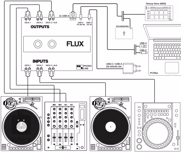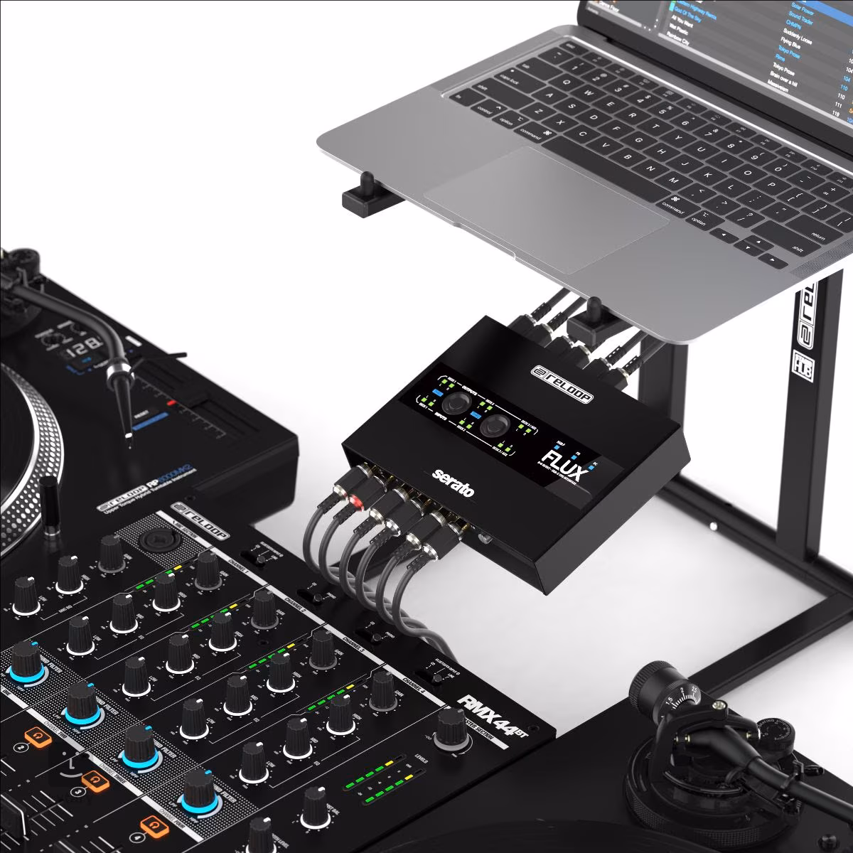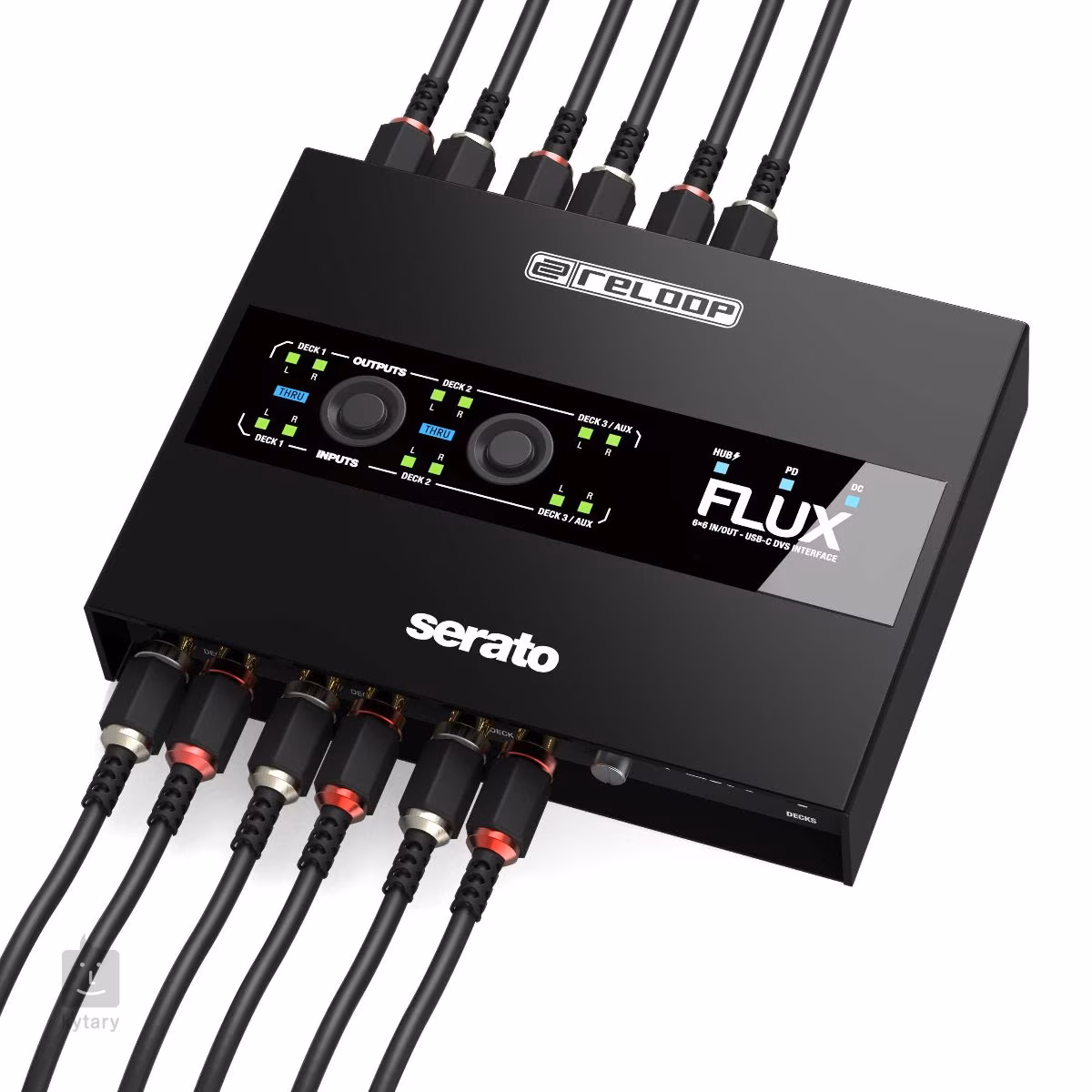 Reloop Flux je USB-C DVS rozhraní určené pro použití s programem Serato DJ Pro. Slouží k propojení s gramofony nebo jinými přehrávači. K propojení slouží tři pozlacené stereo RCA konektory. K přehlednému ovládání přispívají jasné LED diody.