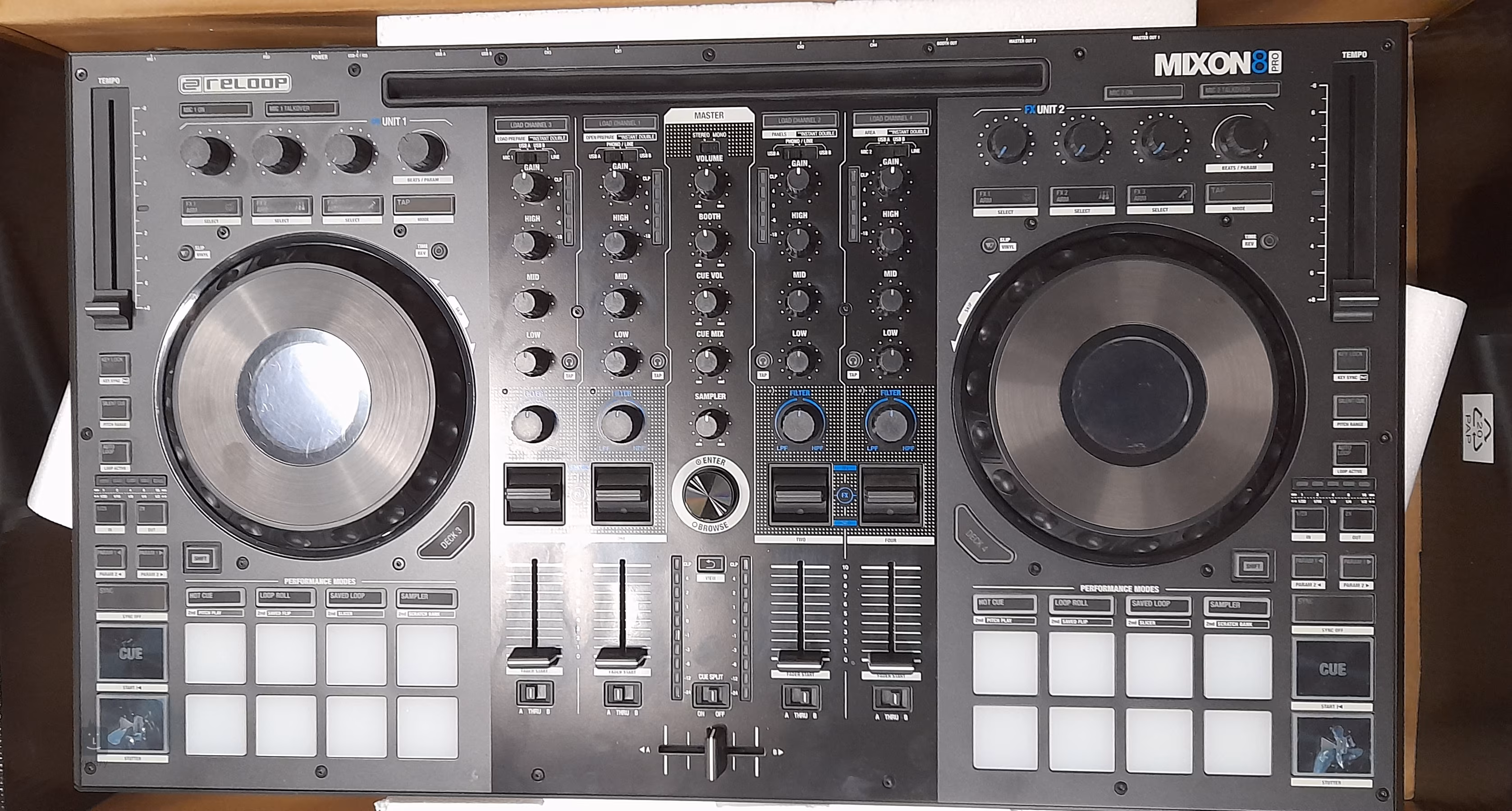 Mixon 8 Pro je multifunkční čtyřkanálový DJ kontrolér od Reloop vhodný pro pokročilejší a profesionální DJ, kteří ho využijí na studiových session, nebo live performance. Kontrolér můžete připojit až ke dvěma zařízením typu PC a laptop, protože Mixon 8 Pro nabízí integrované zvukové rozhraní. Disponuje intuitivním ovládacím panelem s podsvícenými pady, čtyřmi dotykovými FX pedály včetně třípásmového ekvalizéru a výkonnými Jog wheely s víceřádkovým displejem.