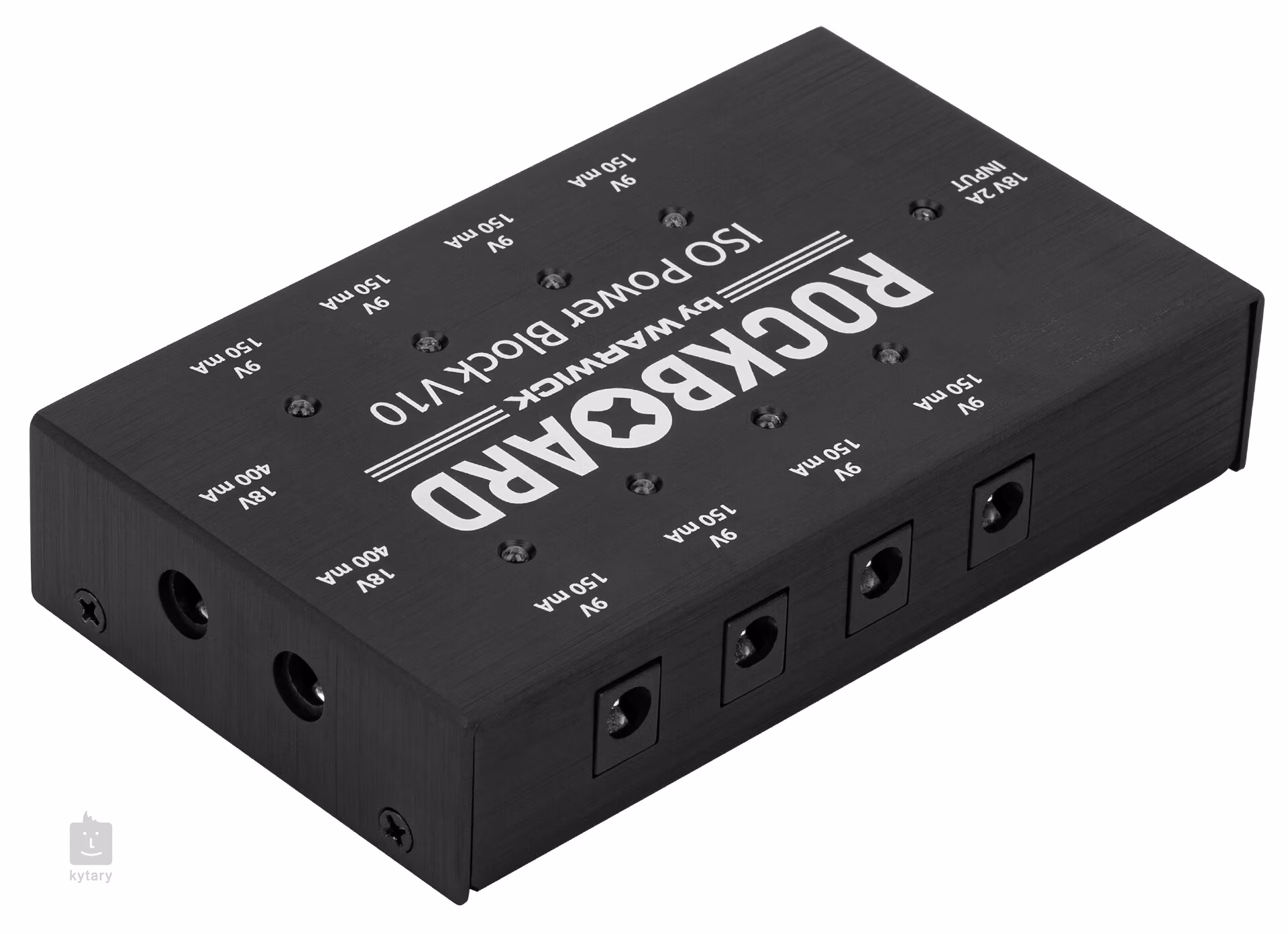 Multiadaptér RockBoard ISO Power Block V10 V2 nabízí osm transformátory izolovaných 9V DC výstupů s maximálním odběrem 150 mA pro napájení většiny běžných efektových pedálů a dva 18V DC výstupy s maximálním odběrem 400 mA pro energeticky náročnější zařízení. Filtrovací technologie použitá u každého napájecího slotu zamezuje vzniku šumu ve vysokých frekvencích. Důležitými prvky jsou také LED indikace u každého napájecího slotu a ochrana proti přepětí, která chrání připojené pedálové efekty proti poškození při zkratu.